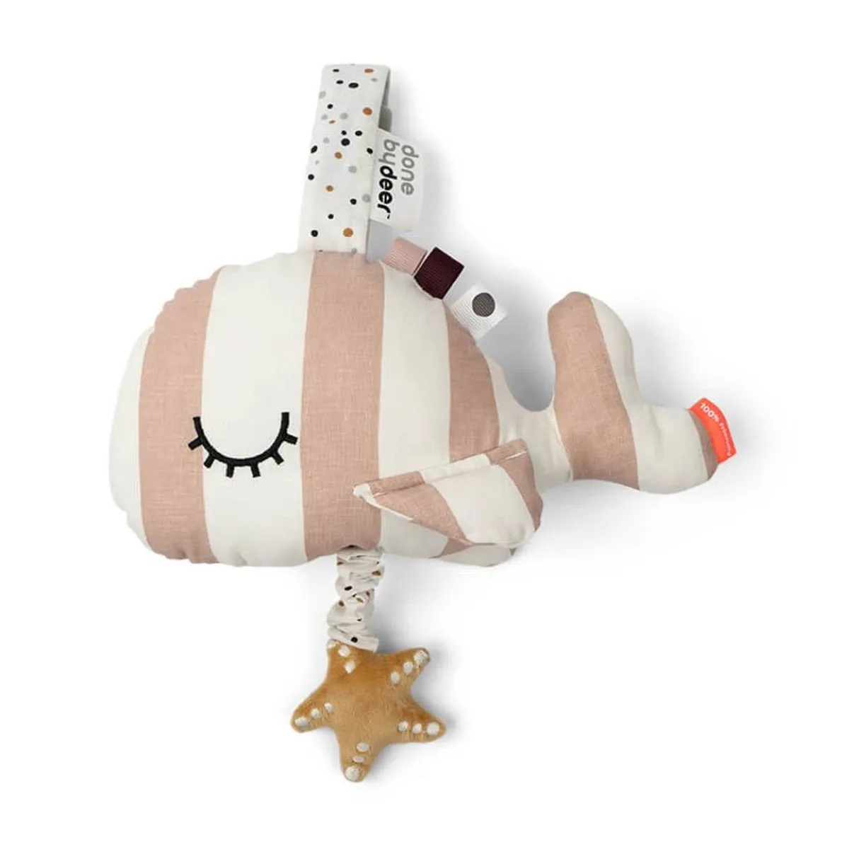 The sleepy whale with stripes has cute details like contrasting dots and a soft starfish. It will calm your little one when it’s time to relax or head off to dreamland.