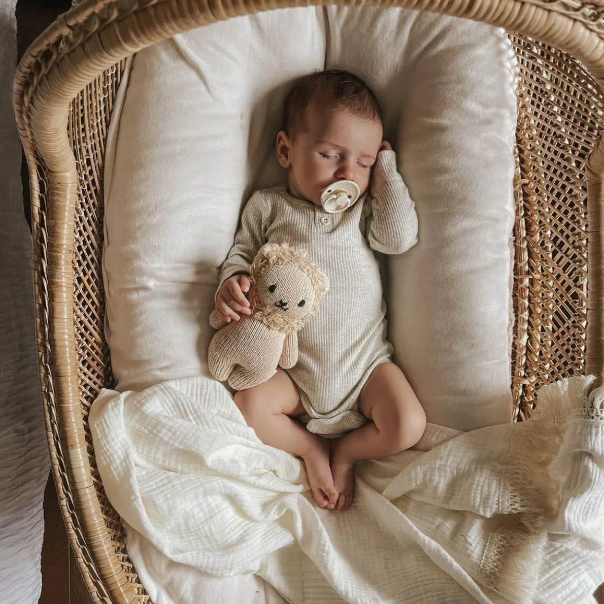 Organic cotton muslin blanket with fringes.