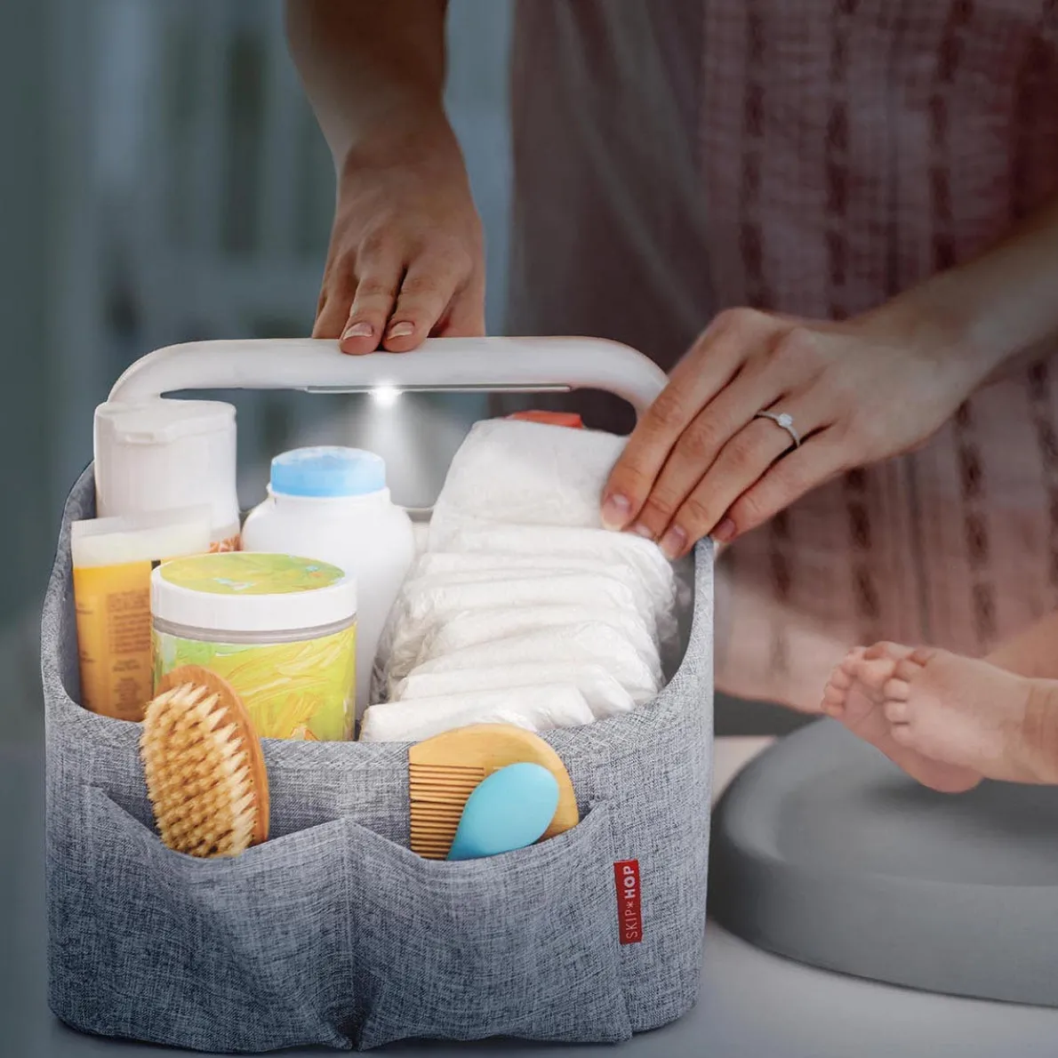 Shed some light on middle-of-the-night diaper changes with our modern diaper caddy! The handle shines softly with a touch sensitive light and a 10 minute auto-off feature. Organize diapers, wipes and more with a modular divider and four pockets.