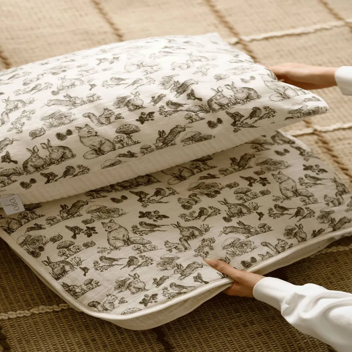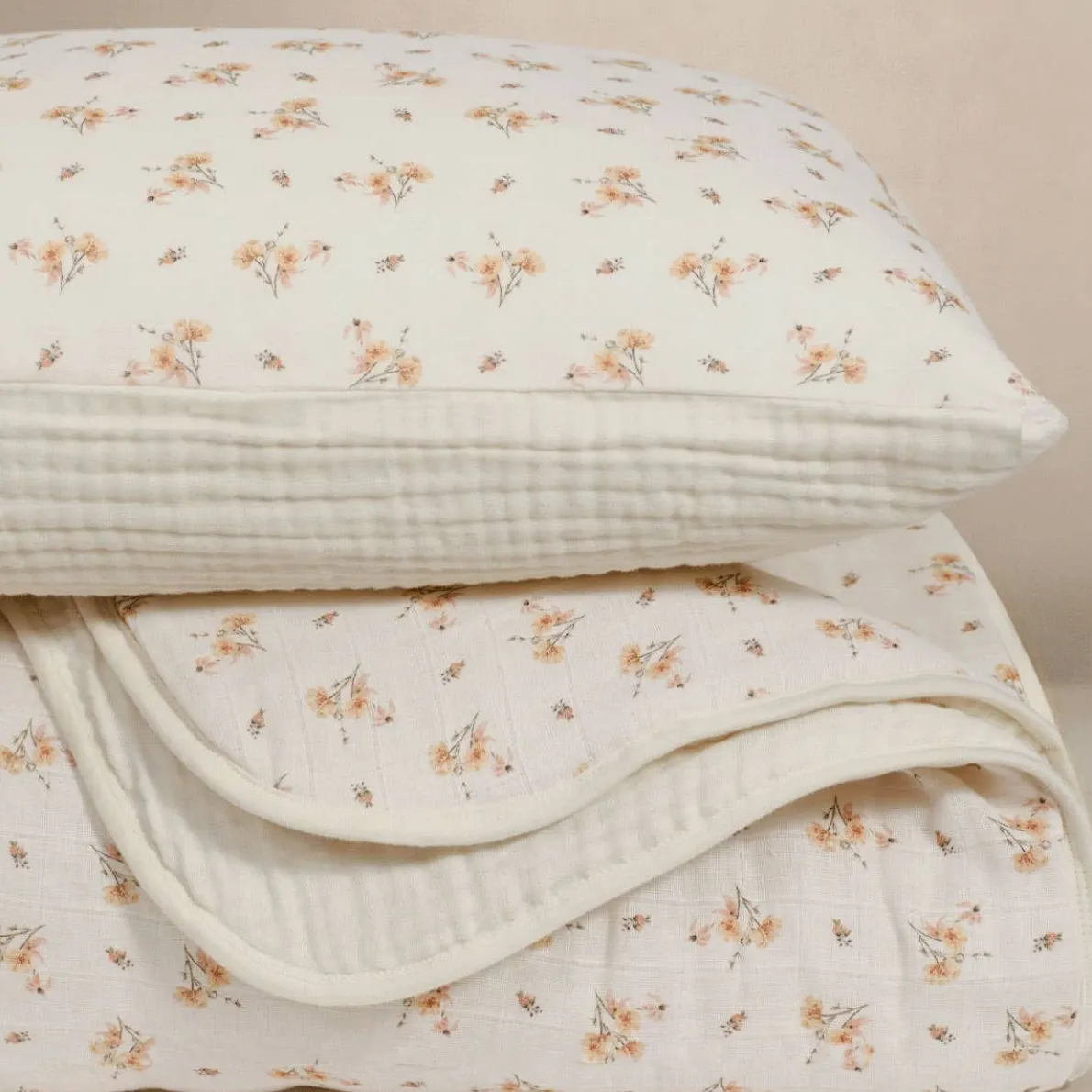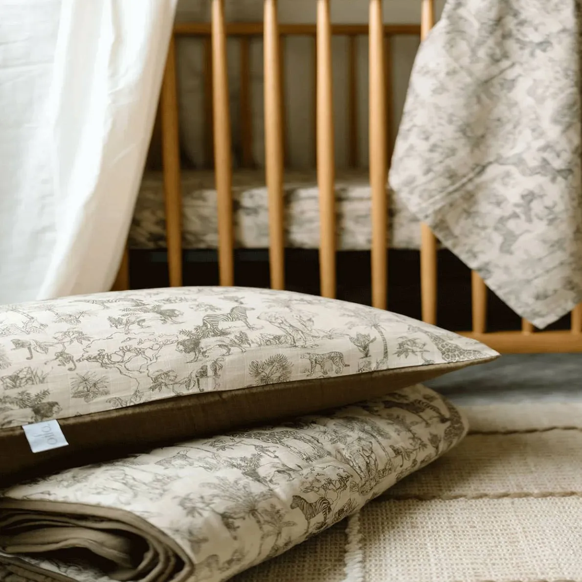 This luxurious muslin sham is crafted from organically grown 5-layers of premium 4-way organic cotton muslin. Beautiful muslin print on one side, and 4 layers of solid color muslin on the other side. Woven with the utmost care using the finest yarn, this results in a wonderfully textured fabric that’s exquisitely soft to the touch and remarkably lightweight, all while maintaining its lasting strength.