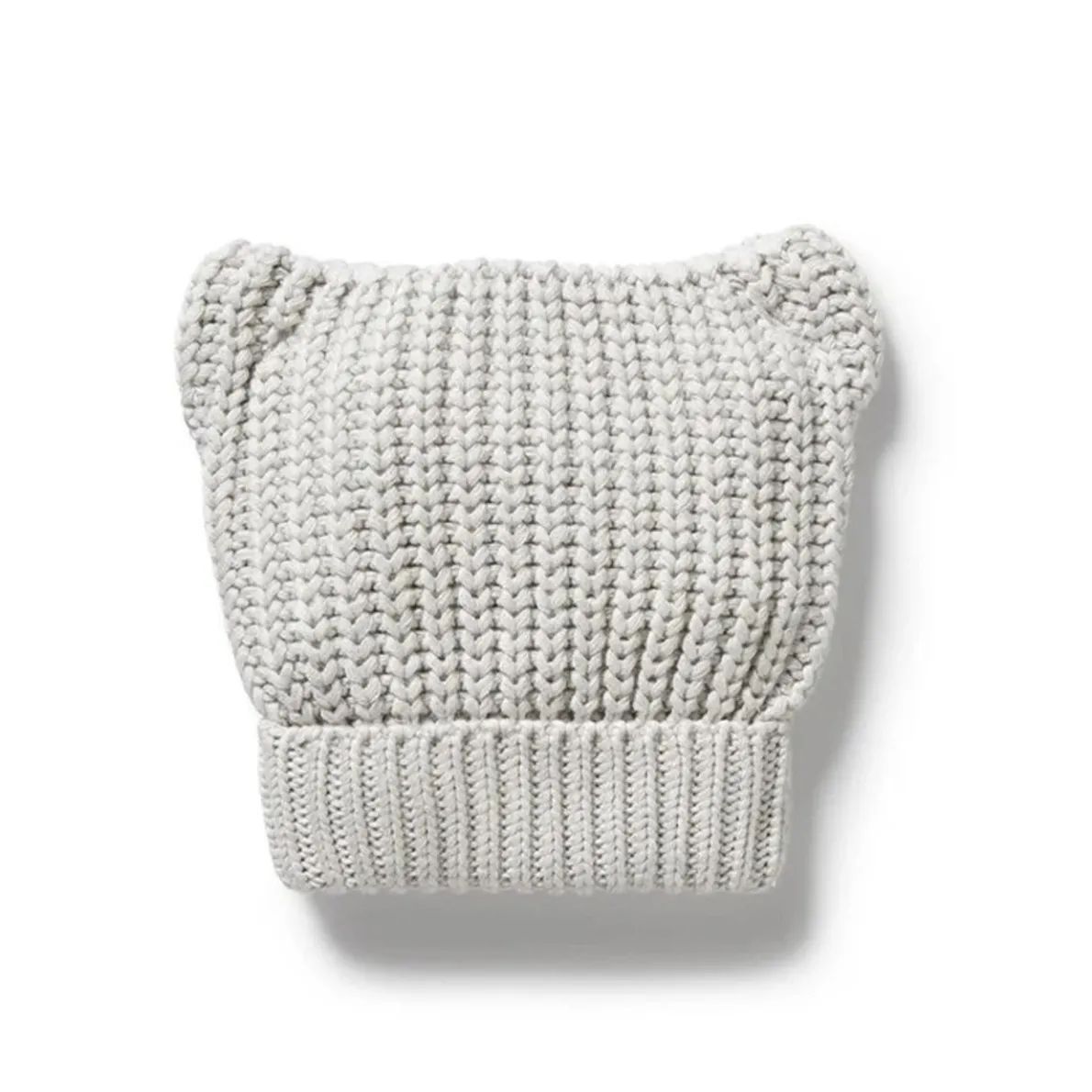 This knitted hat with bear ears is the cutest way to keep little heads warm this winter. Made from organic cotton, bamboo, and wool, it features a soft turn up ribbed cuff for added warmth and comfort. A playful addition to any winter outfit.