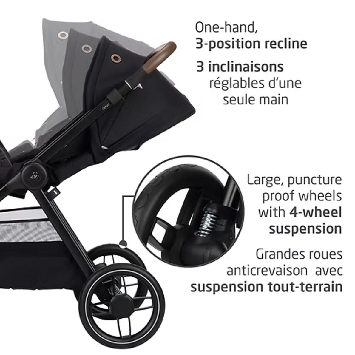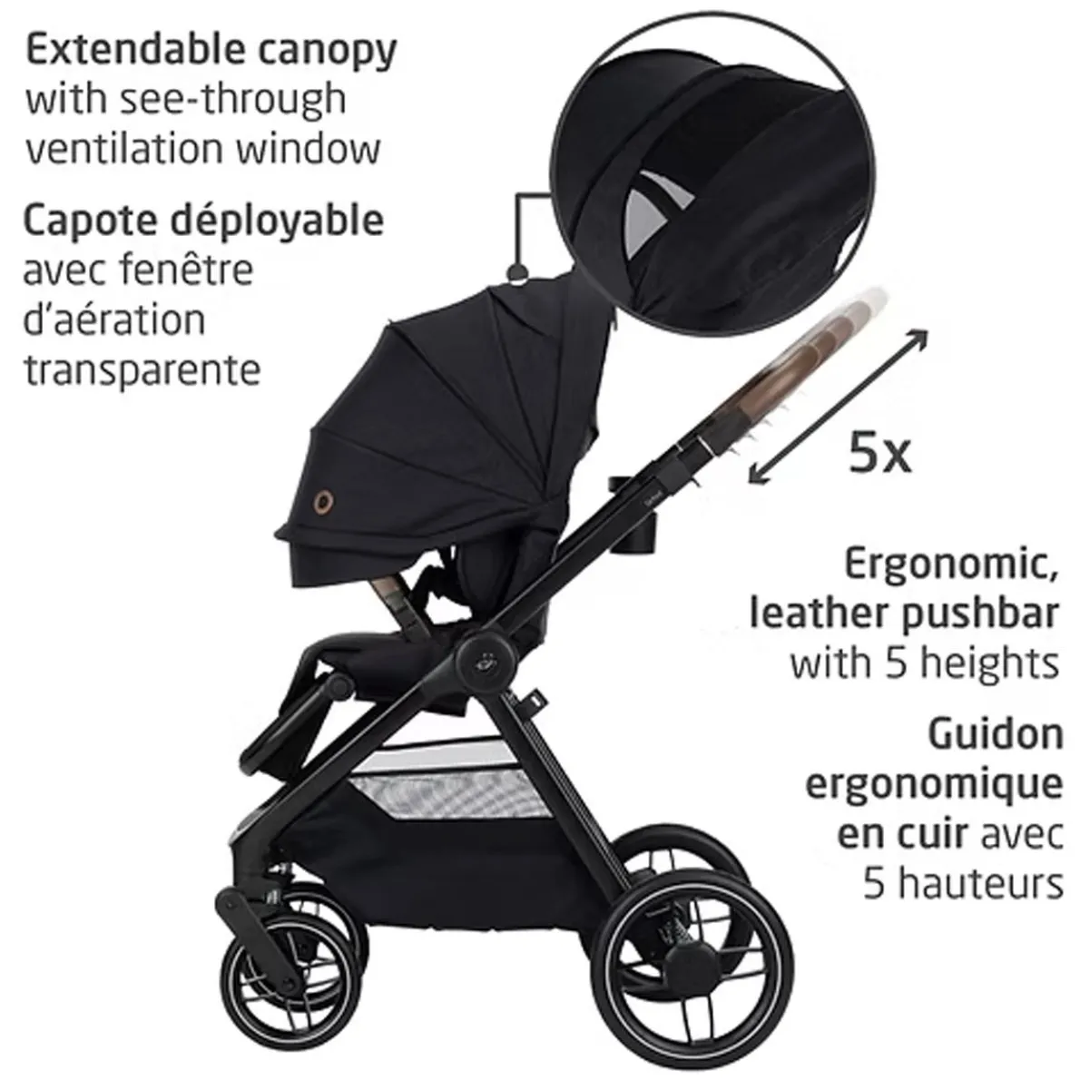 Your baby’s safety and comfort come first. The ClimaFlow™ technology shell provides added ventilation to keep your baby cooler. Side impact protection and plush padding on the removable infant head and lumbar inserts ensures a secure fit and cozy ride. Plus, energy absorbing EPP environmentally-friendly foam in the headrest area to effectively manage impact energy. The extendable ventilated canopy provides maximum shade and airflow. Enjoy added style and comfort with the vegan leather-trimmed ergonomic carrying handle contoured to curve around your hip.