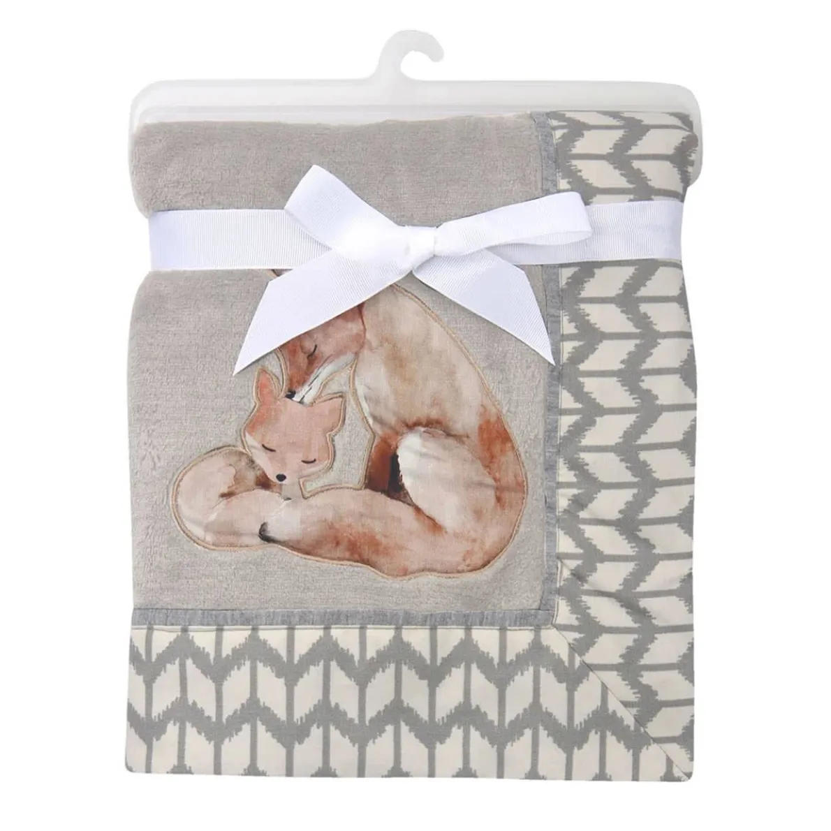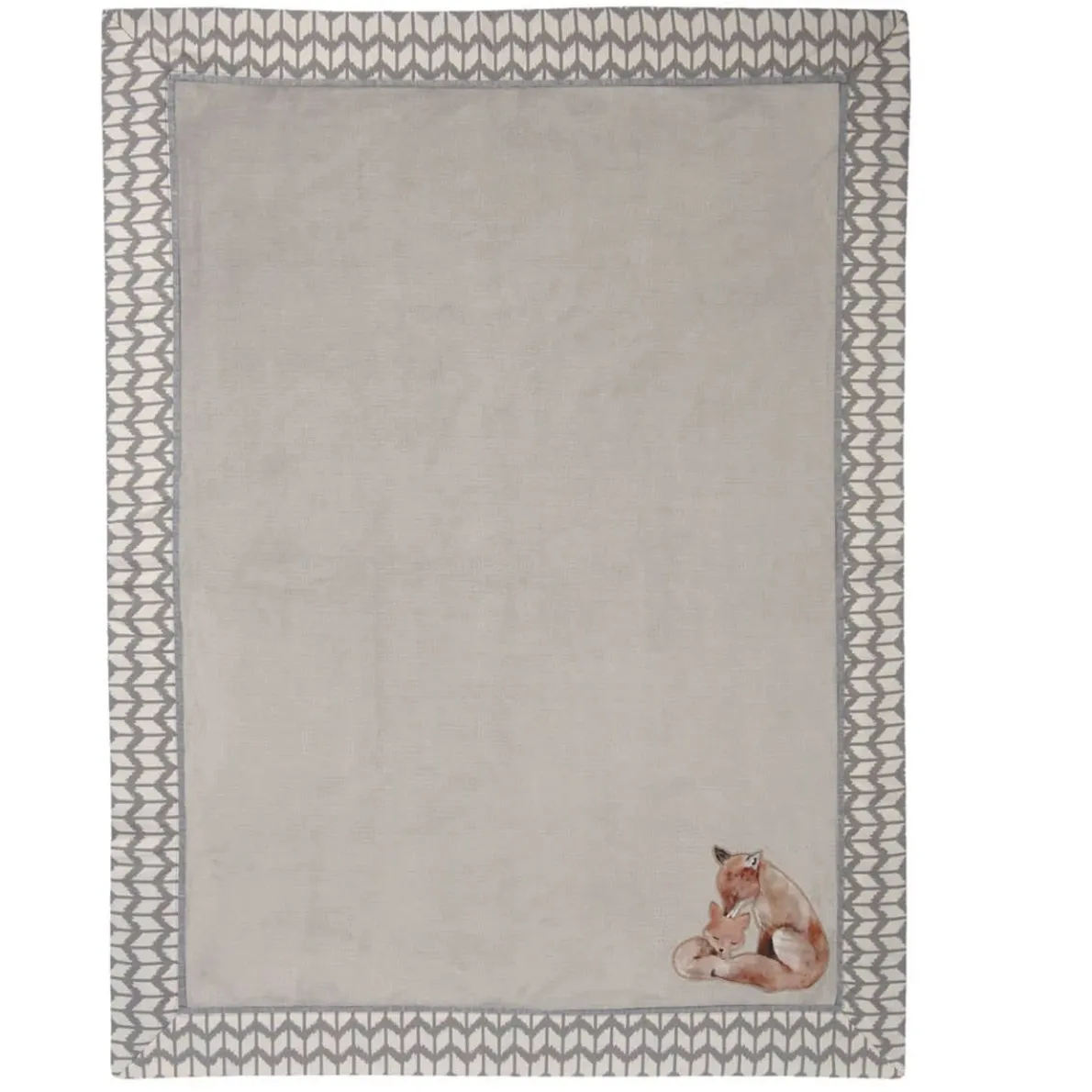 This luxurious gray coral fleece blanket will keep your little one warm and cozy. The watercolor mommy and baby foxes are cuddly together in the corner of the blanket. A woven twill ikat designer print is on the 2 ½” border along with a heather gray jersey flange. This blanket is the perfect size to use as a stroller blanket or for just wrapping up baby at 30” X 40” and makes a great baby shower gift or welcome home baby gift. The trendy gray color looks great at home, on the go, or in any stroller..