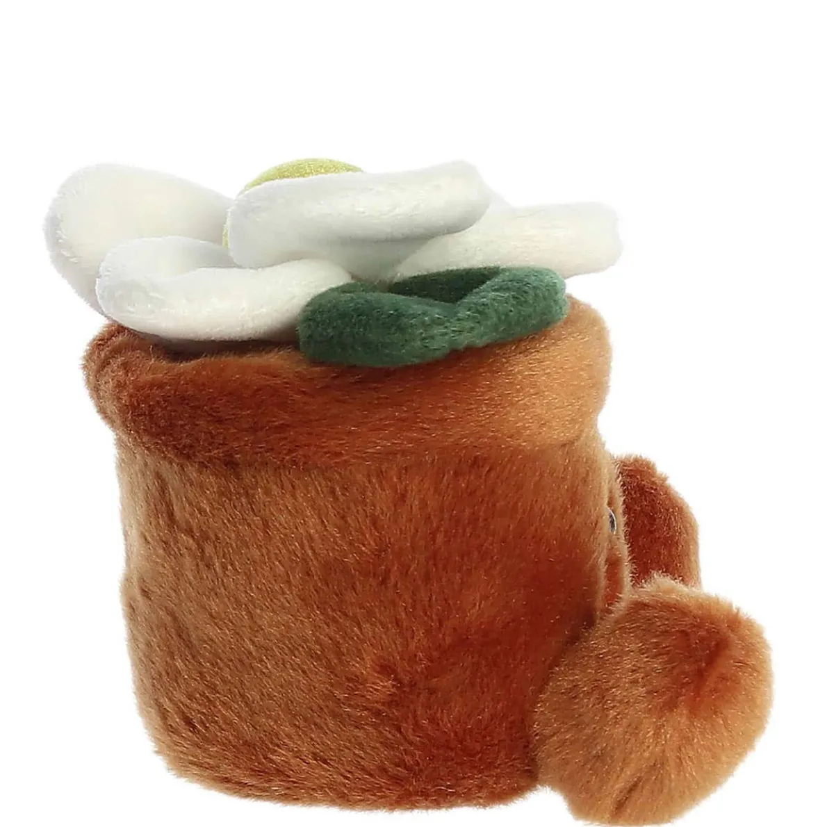 Junie Daisy is a plush toy resembling a cheerful daisy in a pot. The body is a warm terra cotta color, topped with a white daisy with a sunny yellow center and a green leaf!