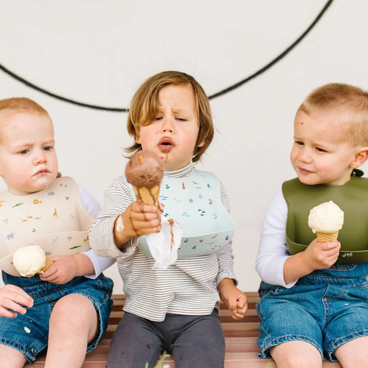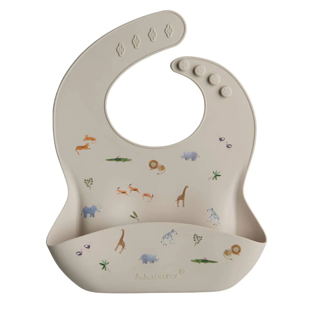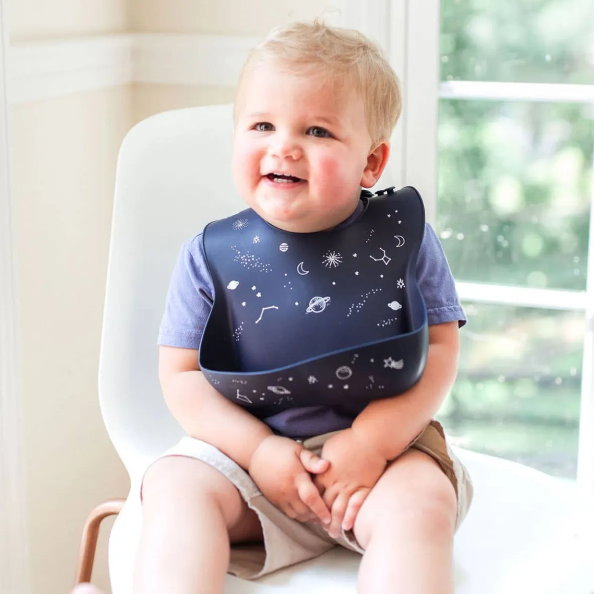 Loulou Lollipop silicone bibs are buttery soft, waterproof, and stain-resistant. It is easy to clean; simply wipe down for a quick cleaning or put it in the top rack dishwasher for a deep clean. It features a wide catch-all pouch that sits below a high chair tray – perfect for collecting food, crumbs, and spills. Reinforced buttonholes for a durable and adjustable fit for long-lasting wear, suitable for ages 3 – 36 months. This handy bib is available in various modern colors and fresh designs to make mealtime fun and enjoyable.