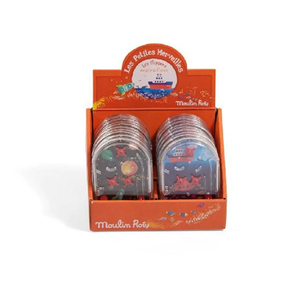 Assortment of pocket pinball machines decorated with a nautical or space theme. Pull the handle to release the 5 little balls and add up your points – it’s your turn now!