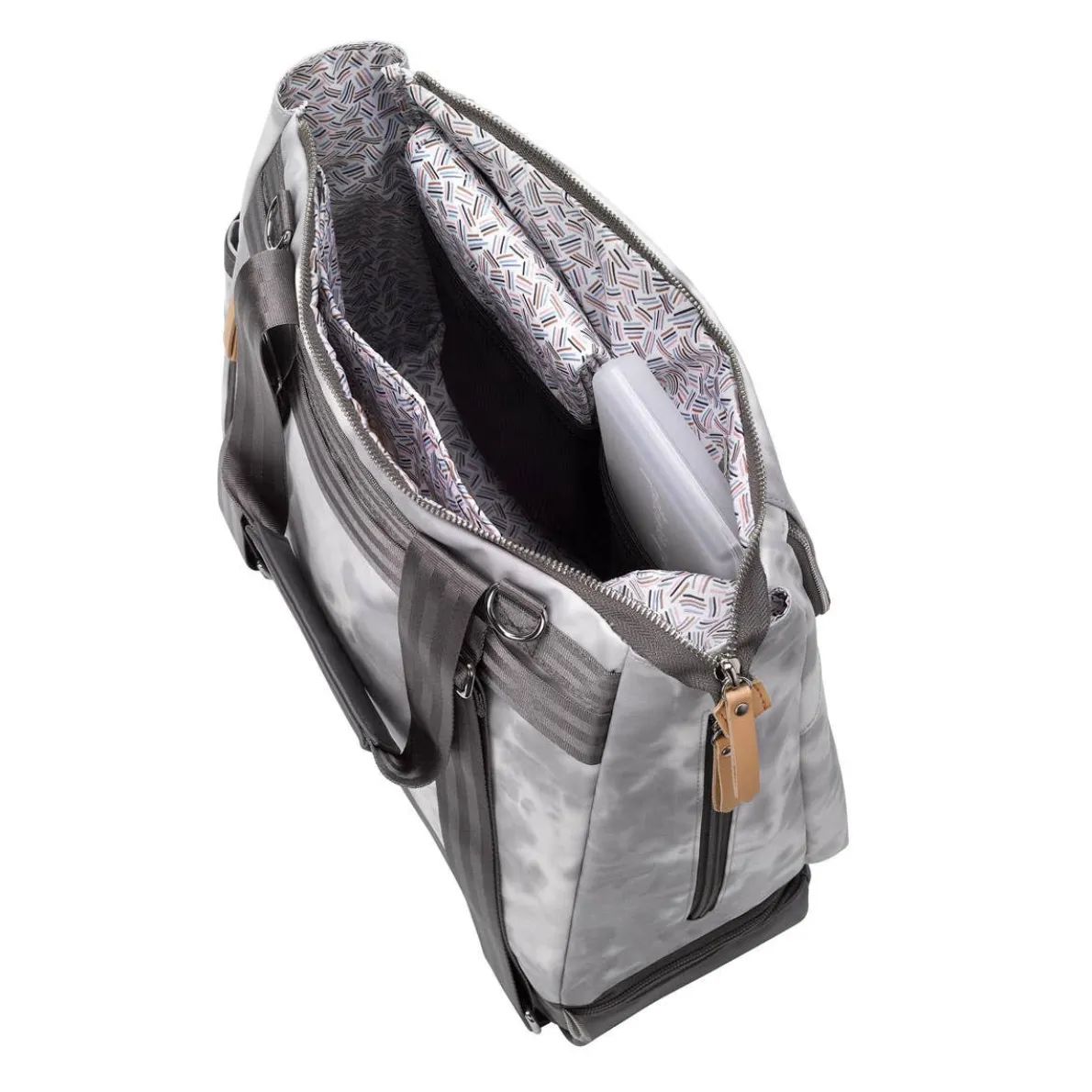 - Insulated front zippered pocket, hidden side bottle pocket and spacious zip-around bottom compartment, all with wipe-able PEVA antimicrobial lining