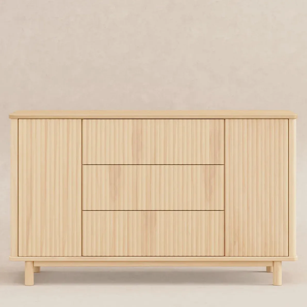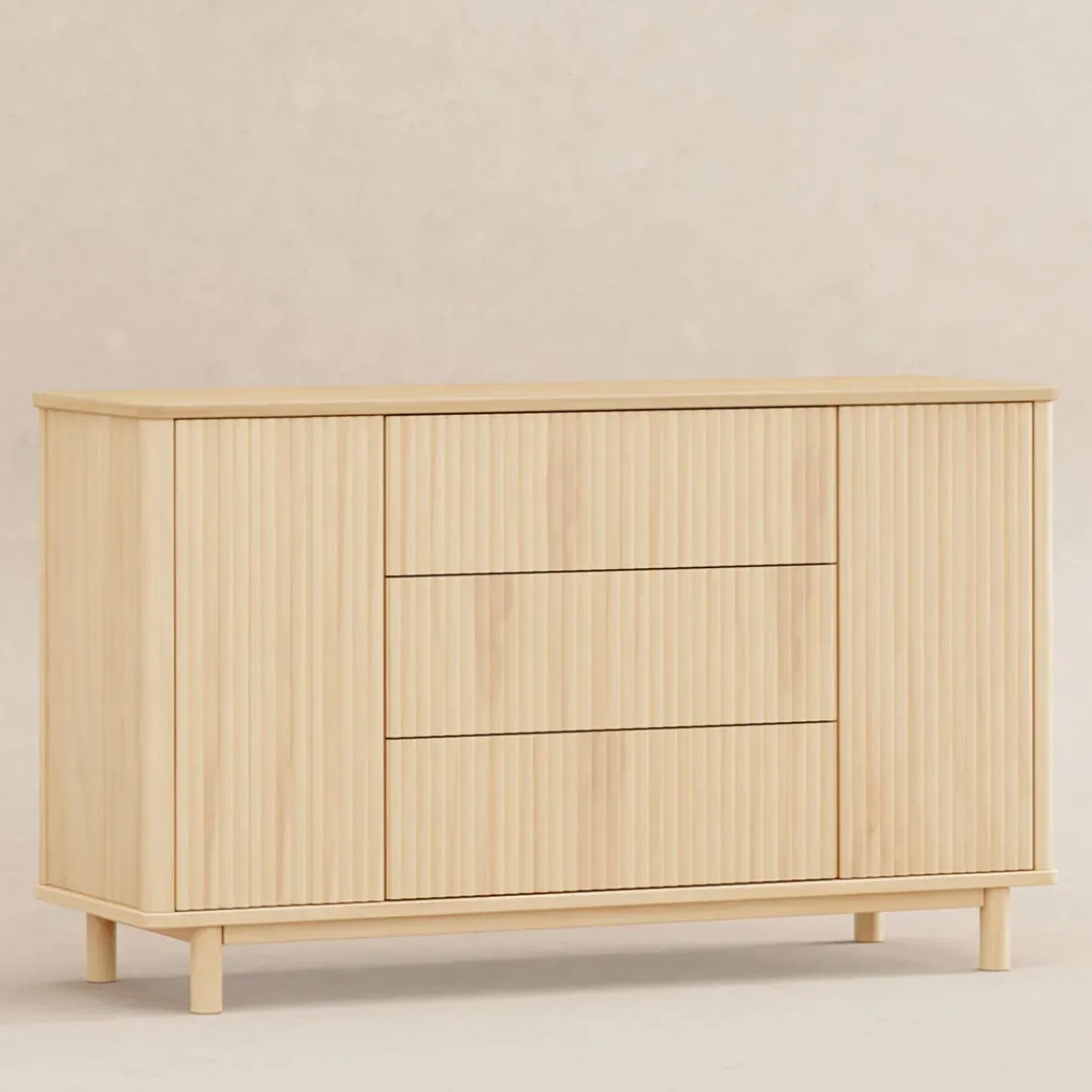 The timeless Pogo Tambour Dresser by Babyletto exudes modern elegance with its textured fluted tambour paneling, smooth, rounded edges, and elevated silhouette. Designed for the nursery but beautiful enough for use throughout the home, it features push to open smooth-gliding drawers, spacious side cabinets, included anti-tip kit for safety, and best-of-all, the Pogo Tambour Dresser by Babyletto arrives fully assembled, ready out of the box.