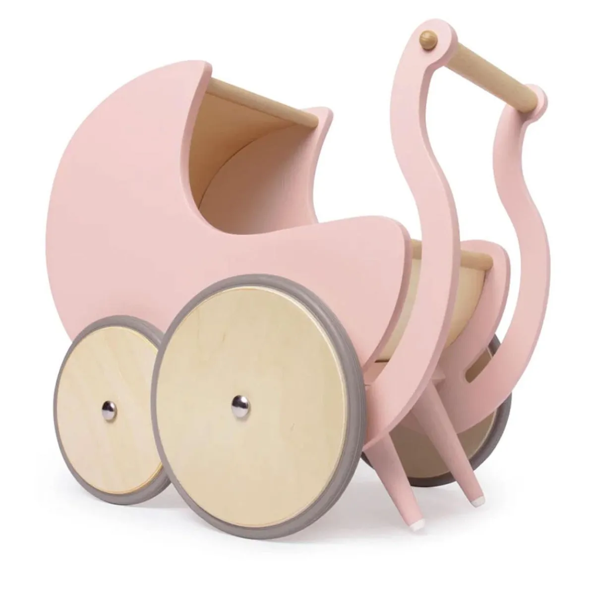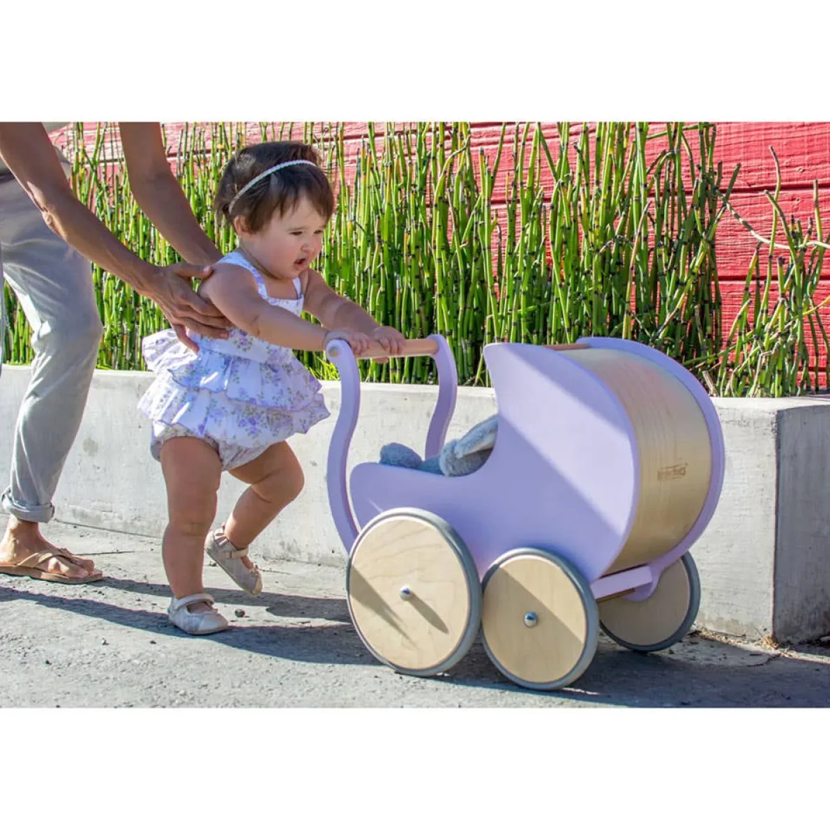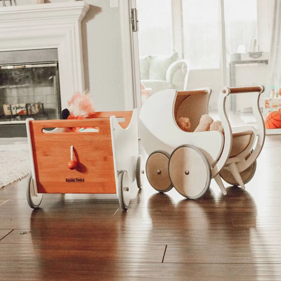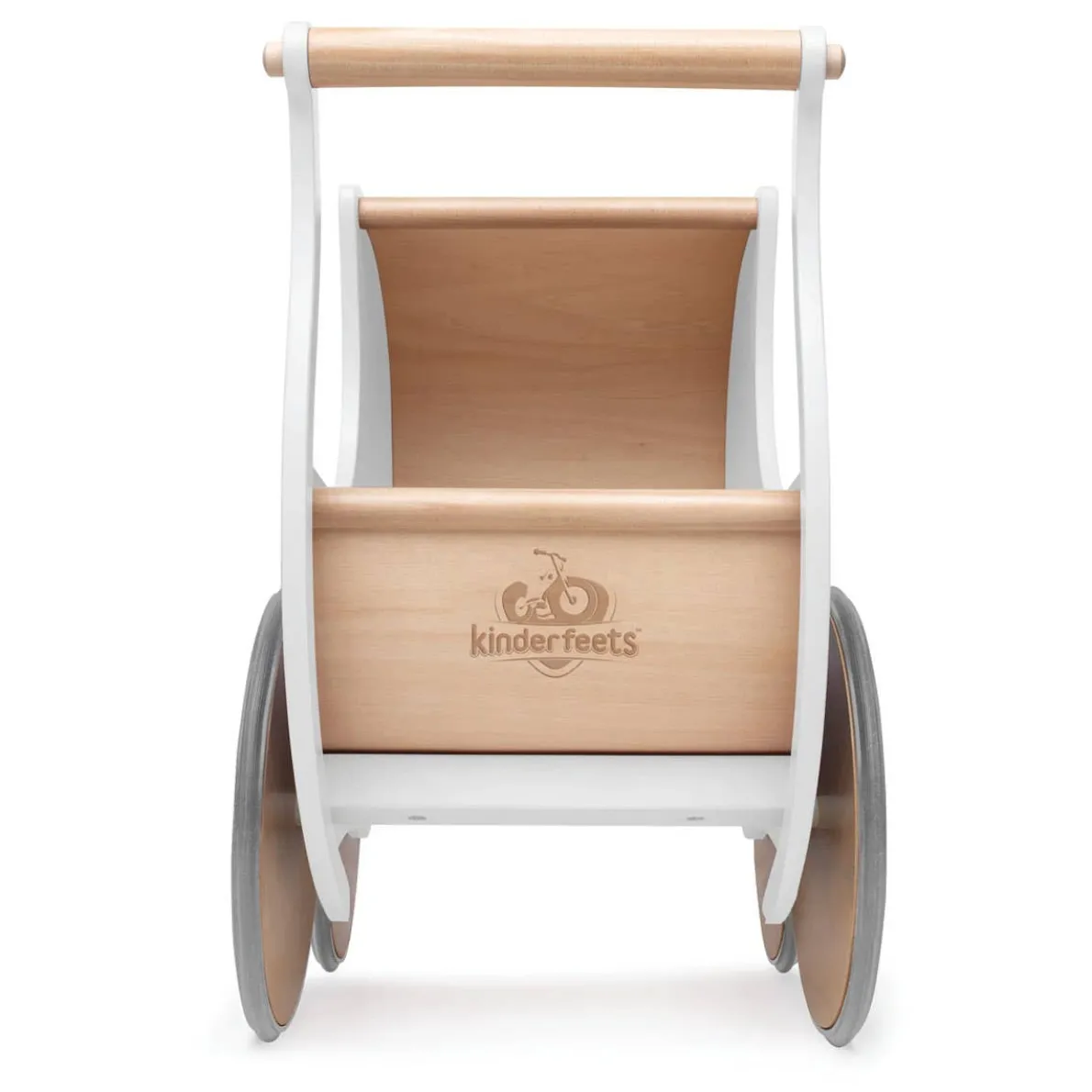 Handmade with replenishable birch wood, fitted with large wheels that have rubber trim to prevent scratches and sitting at a handlebar height of 17 inches (35 centimeters), the Kinderfeets Pram 2-in-1 Walker is a unique option for newly active children.