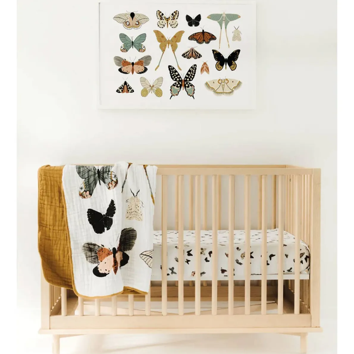 Butterfly in the skyyy, I can go twice as high. Take a look, Butterfly Collector Quilt has Clementine kids hearts all a flutter. One side is covered in beautiful butterflies and fuzzy moths, and the other is a warm mustard yellow color. This rainbow print you know and love with a crisp clean white edging and back. A golden sun setting over the mountains.
