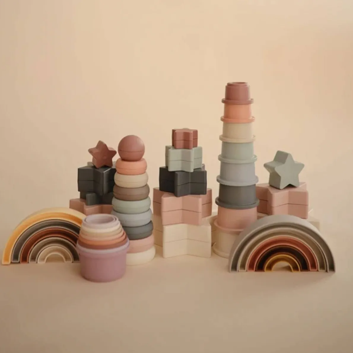 - Stacker toys are recommended to engage cognitive reasoning, fine motor skills, and language development.
