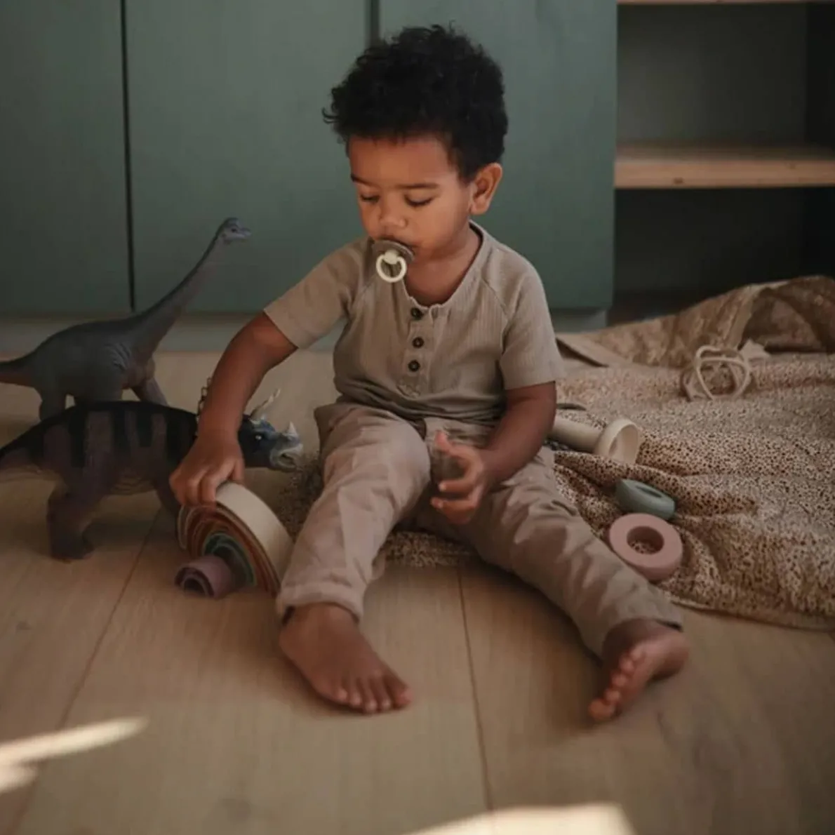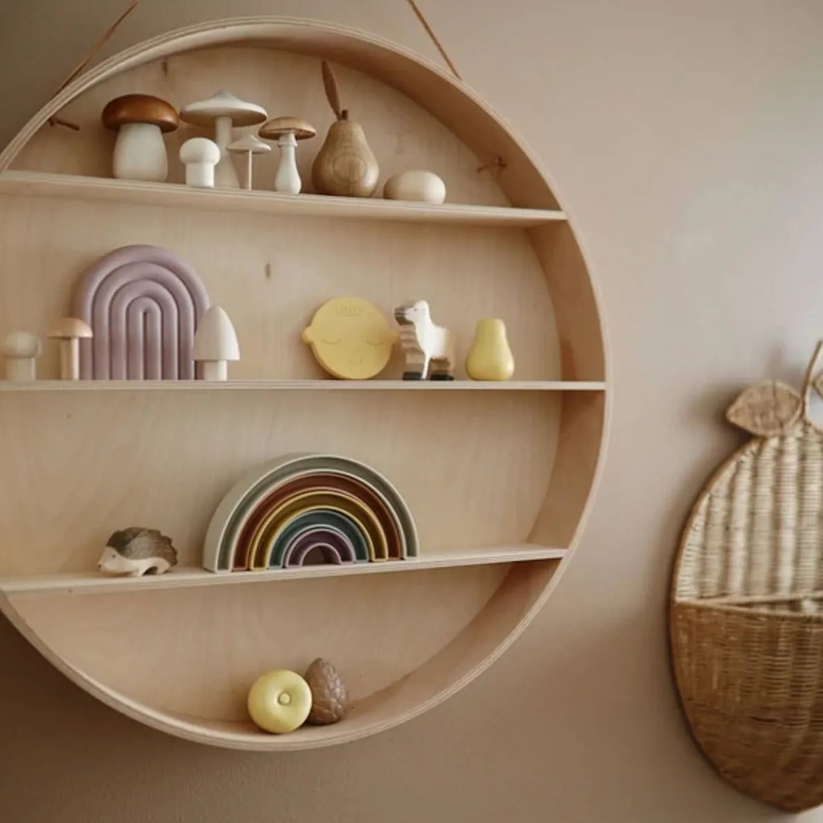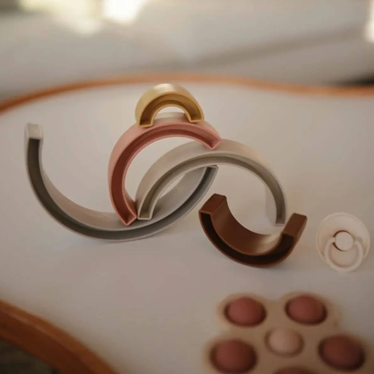 From Mushie Danish hygge collection comes this playful rainbow stacker, inspired by the rainbow skywalk in Aarhus, Denmark. Little ones will sort, stack and play with this beautiful set, all while learning with soft colors and developing their fine motor skills.