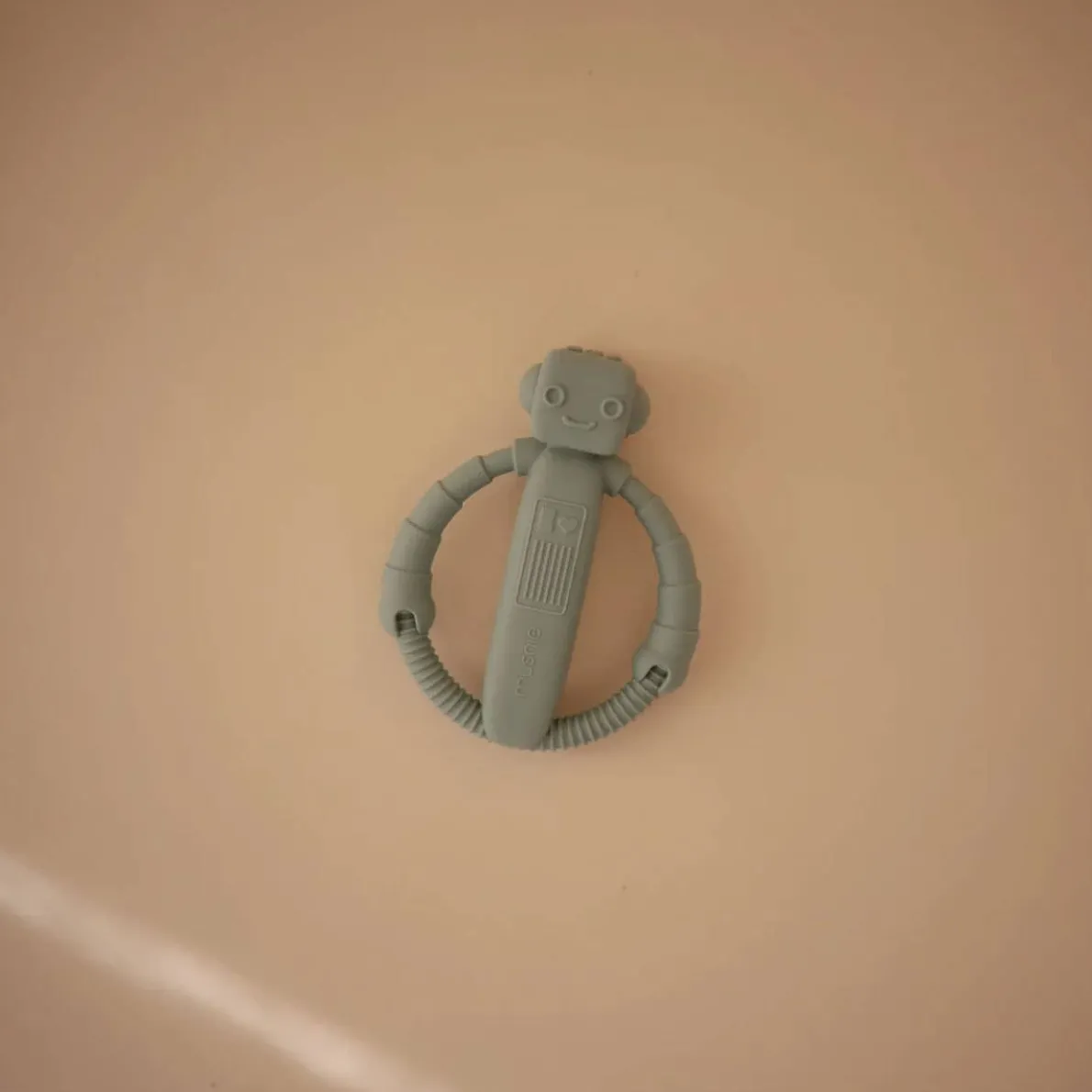 Inspired by outer space and technology, designed with functionality and comfort in mind, the silicone Rocket and Robot Rattle Teether features a playful rocket shape and robot ship and built-in rattle. The cheerful sound engages baby’s auditory senses for added soothing relief.