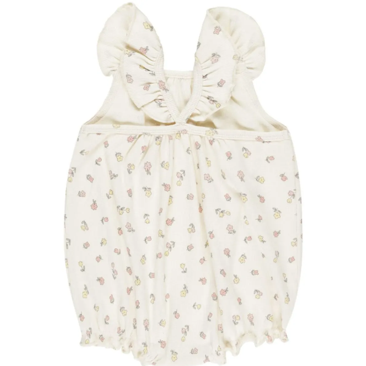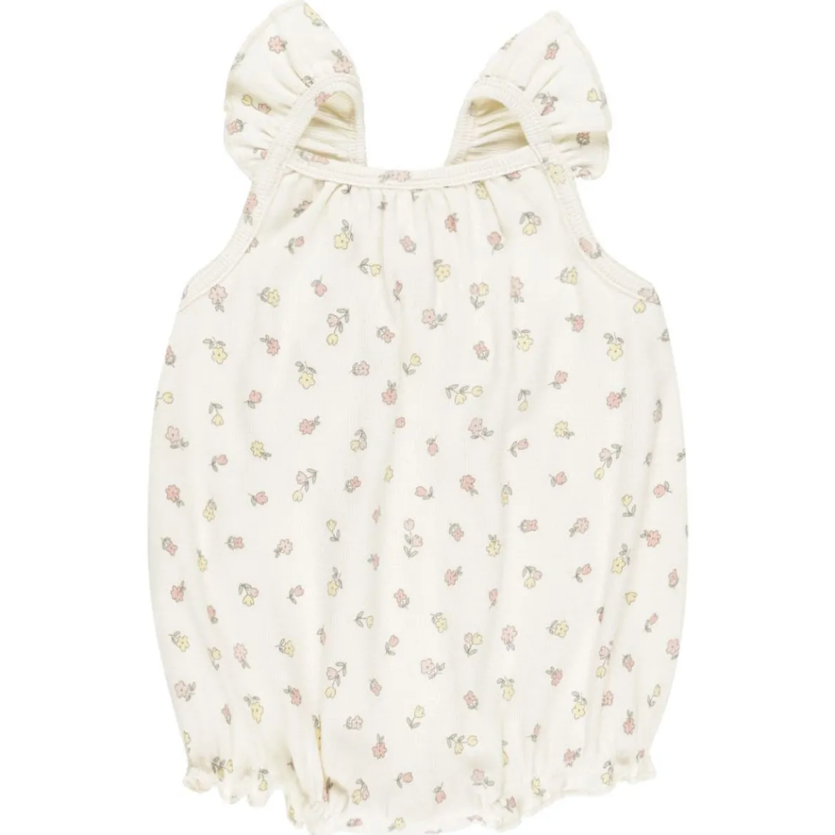 This romper is your go-to for the summer! Featuring ruffle detail at the shoulders, gathered elastic leg openings, and bottom snaps for easy changes.