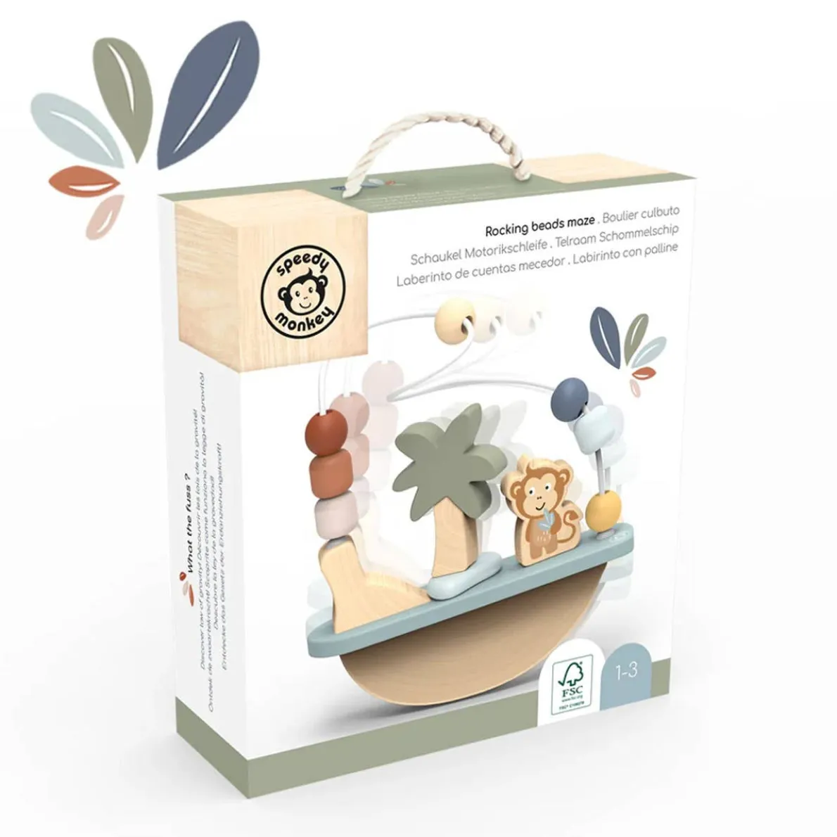 This soft colored wooden monkey bead maze rocks gently from side to side and twists and turns around and around. Enjoy taking the 7 beads from one end, over the palm tree to the other side for the monkey. Helps to develop dexterity and co-ordination. This toy is crafted from sustainably sourced wood from FSC® certified forests and coated with non toxic paint.