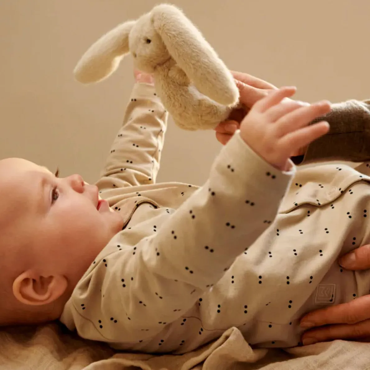 Shaped like a little whale, the plush teddy rattle makes a cute companion for stroller rides or nappy changes. The bell inside and the super soft plush material provide sensory and engaging entertainment for little ones. Perfect for gifting to newborns and smaller babies.