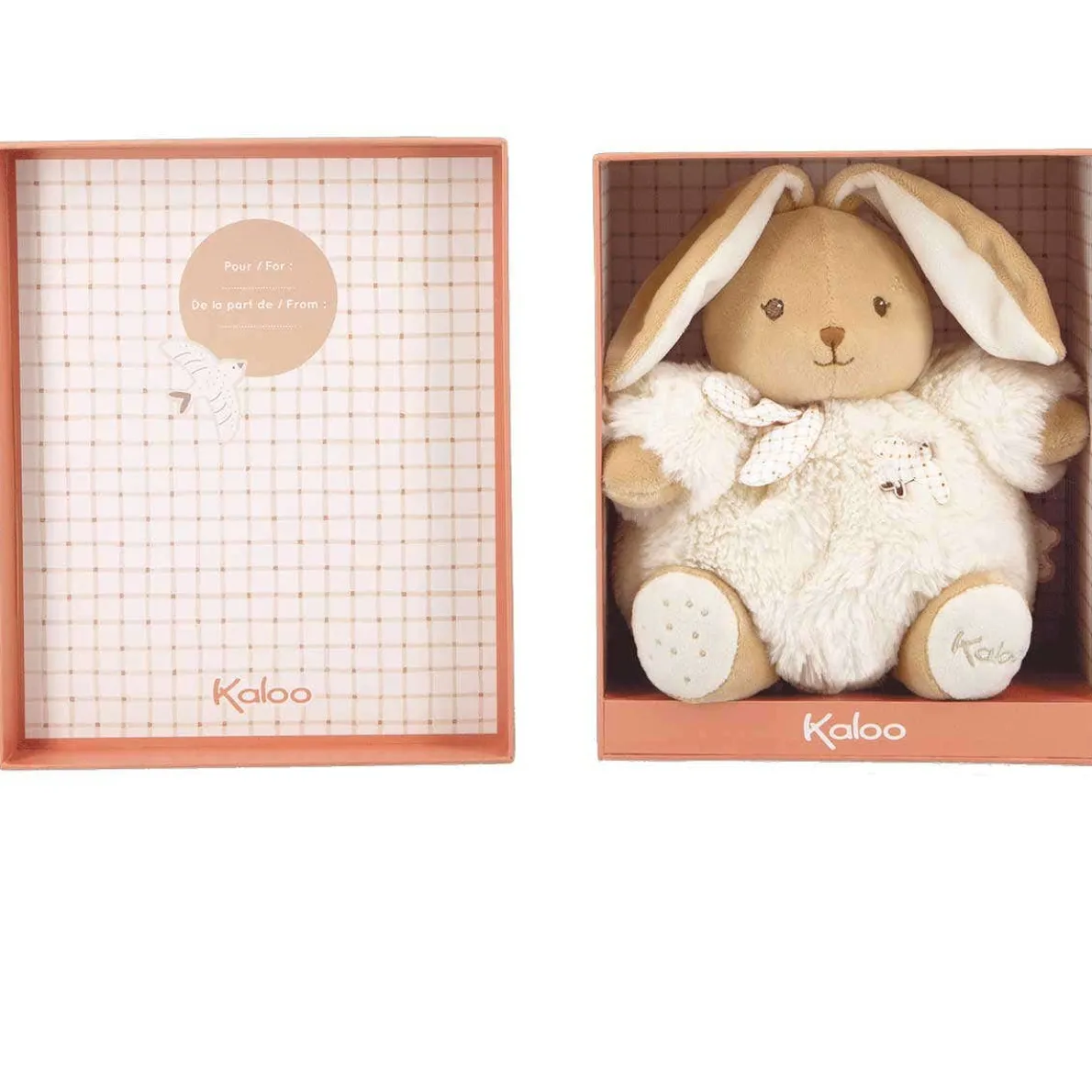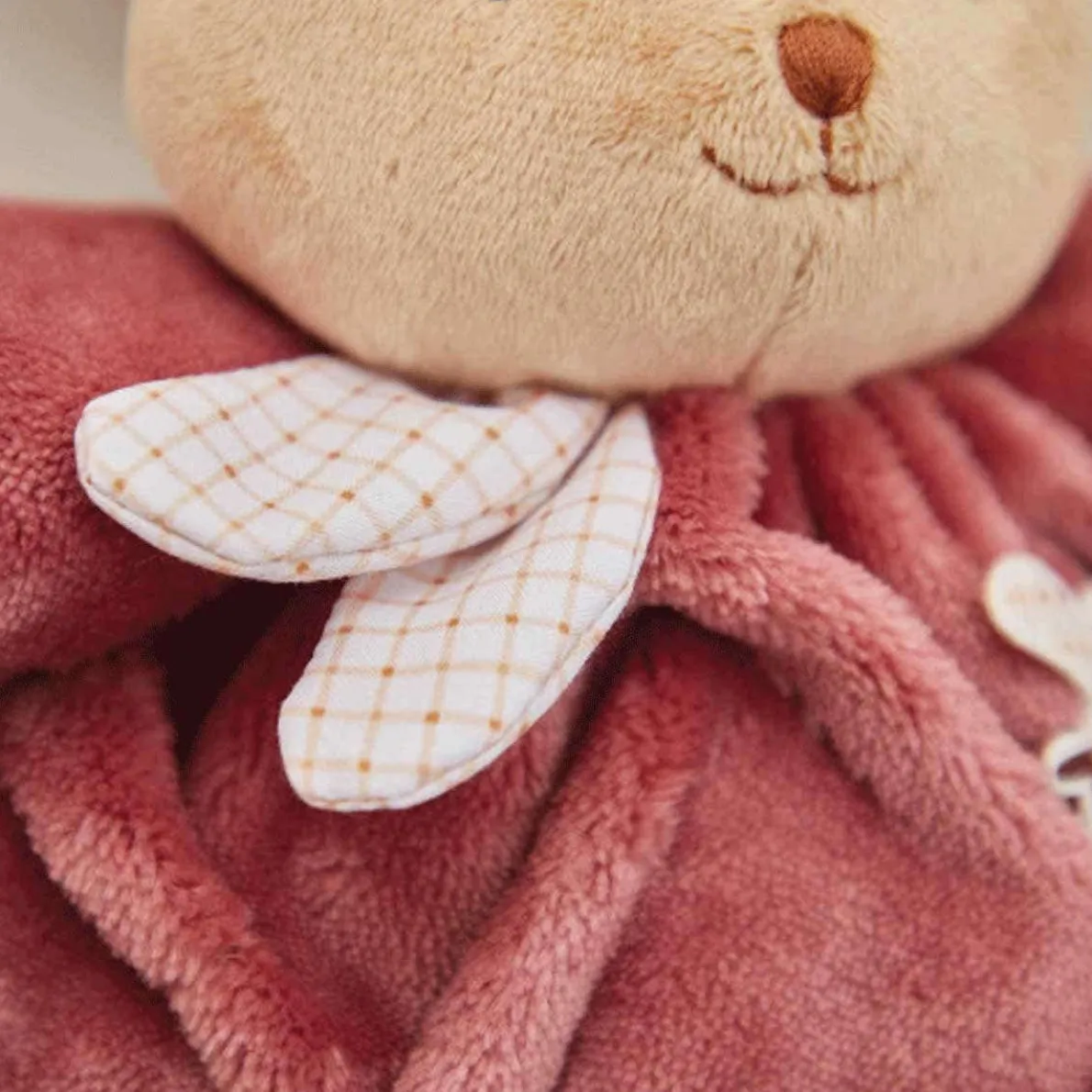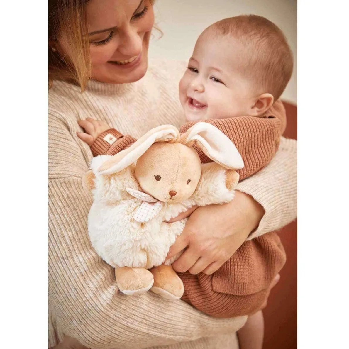 A friendly and generous plush rabbit! Measuring 17 cm and featuring many refined details, this bunny is perfect for babies from birth. Its fur offers such intense softness! Baby can easily grab his new plush friend by the arms and ears. In addition to its cute face, this rabbit plush has an incredibly soft and fluffy belly, perfect for cuddles. Carefully crafted, it is made of 95% recycled materials (synthetic fur, micro-velvet, poplin), including its recycled polyester padding. You can machine wash this rabbit plush at 30°.
