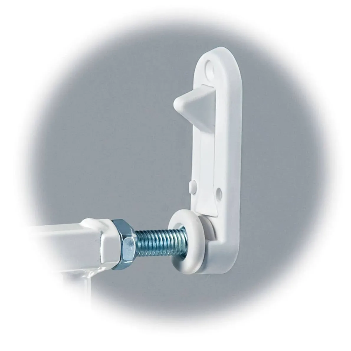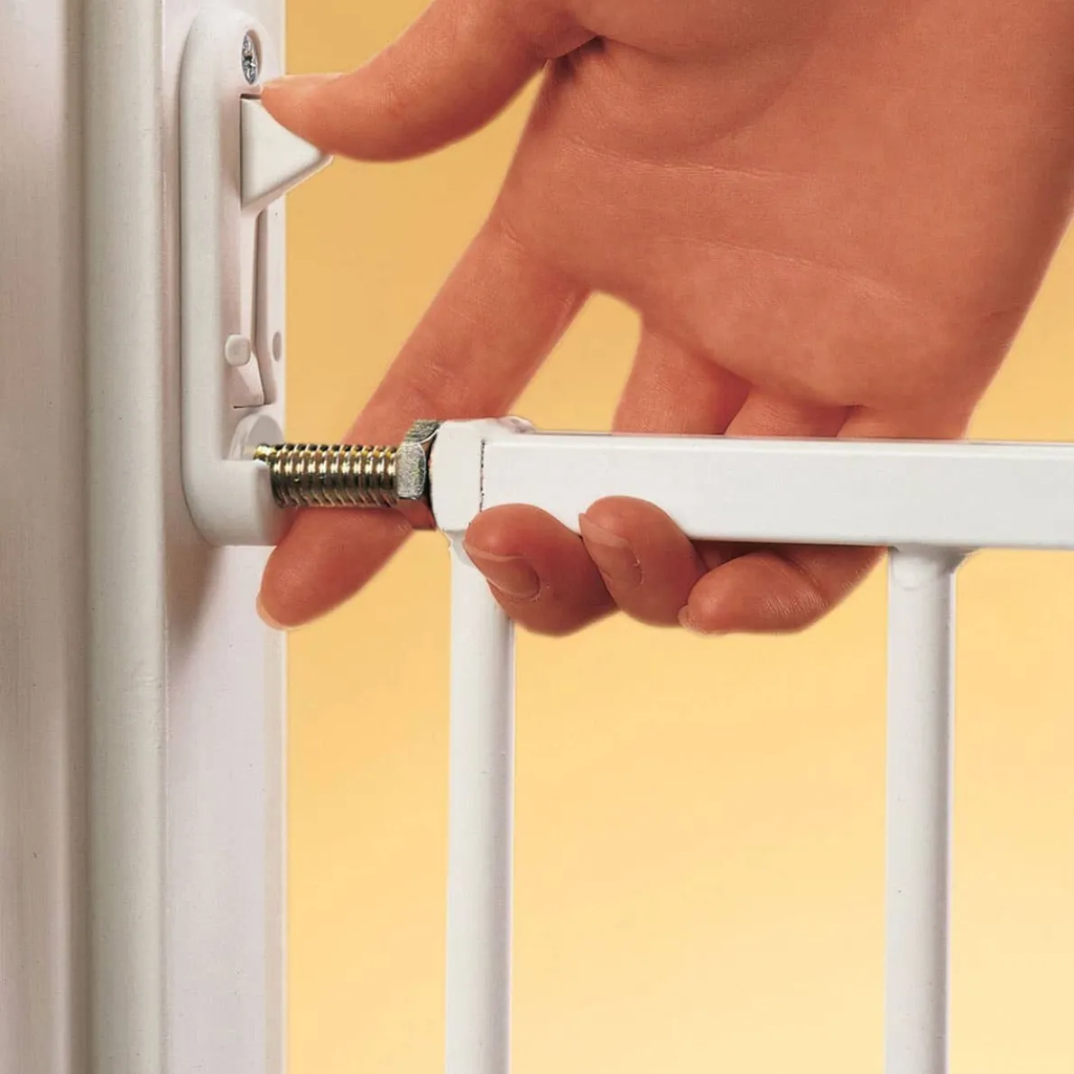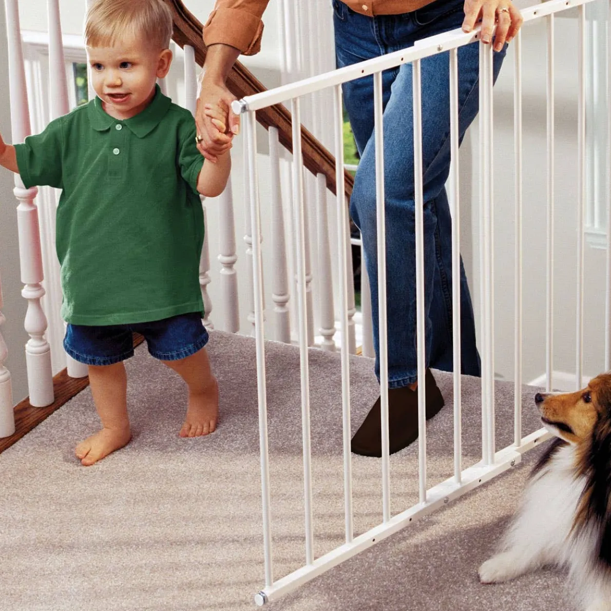 The KidCo® Safeway® baby safety gate is specifically designed for top of stairs use, but can also be used in hallways or as a room divider. Provides maximum safety at the top of stairs and in high traffic doorways. Features include stop pin to prevent gate from swinging over open stairs, quick release hardware and a mounting template for safe installation.