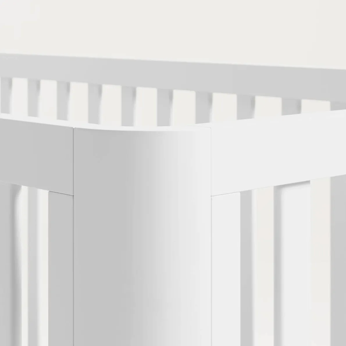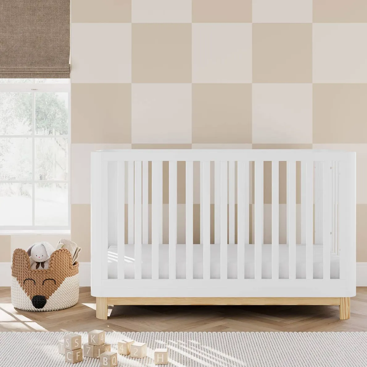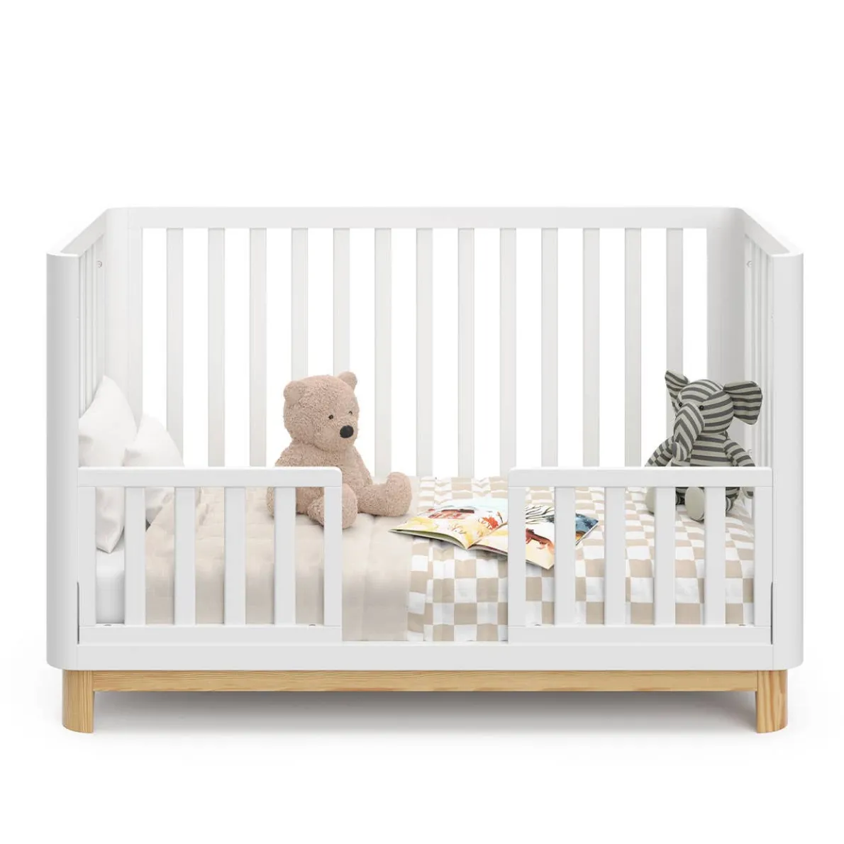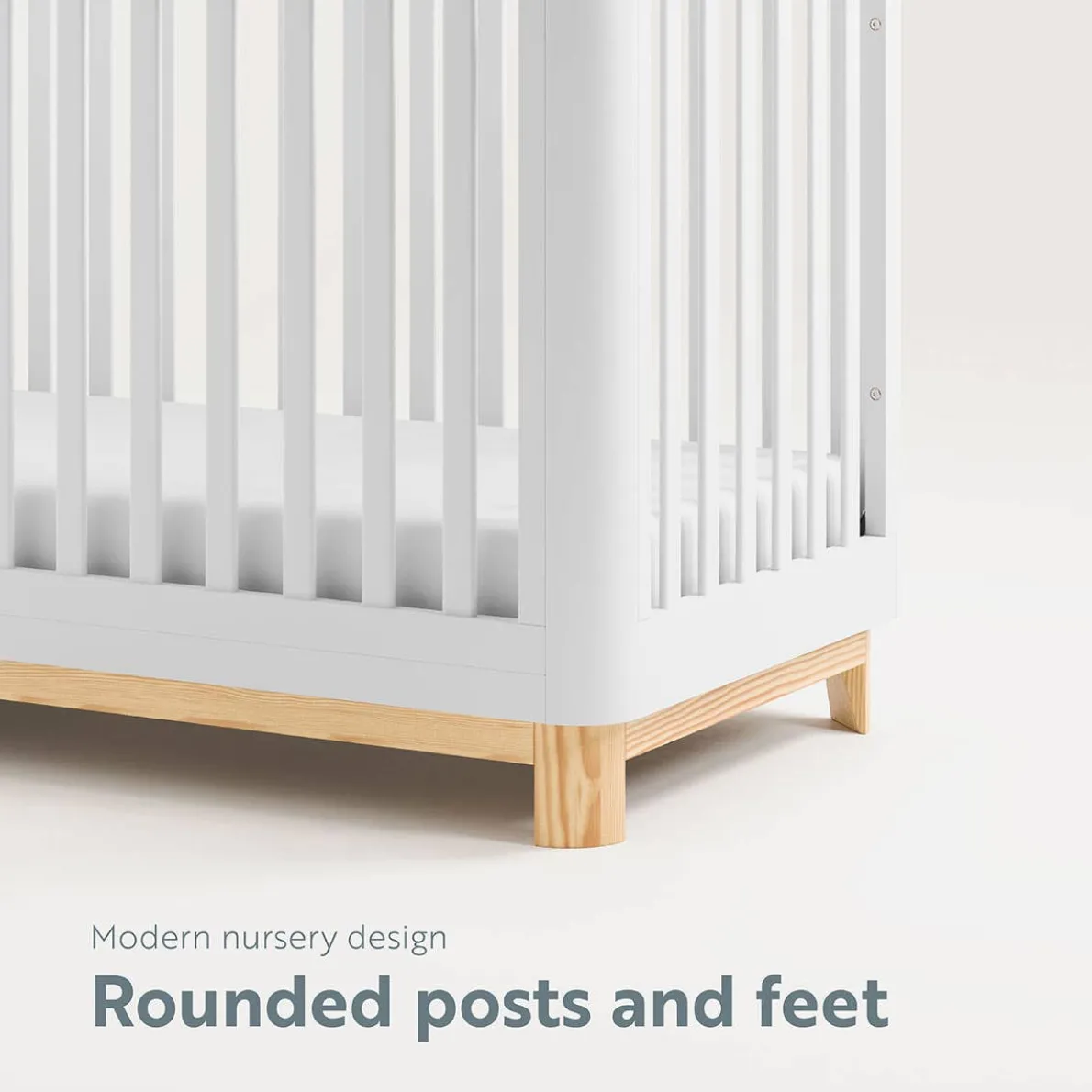 - 3-IN-1 CONVERTIBLE CRIB: Converts from baby crib (mattress sold separately) to toddler bed (compatible with 1 or 2 toddler guardrails – each sold separately), and daybed; Modern baby crib, stylish 2-tone design, natural wood base, and rounded posts