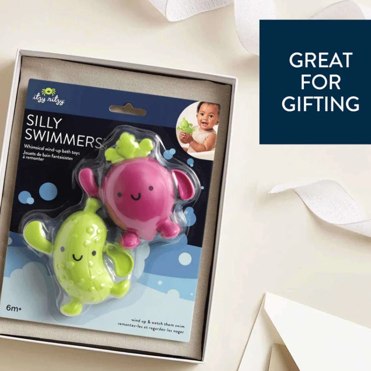 On Your Mark, Get Set, Play! Bring fun to your clean routine with these adorable Silly Swimmers™! With wind-up paddle arms, these cute characters add panache to your splash as they zip across the water and encourage imaginative play.