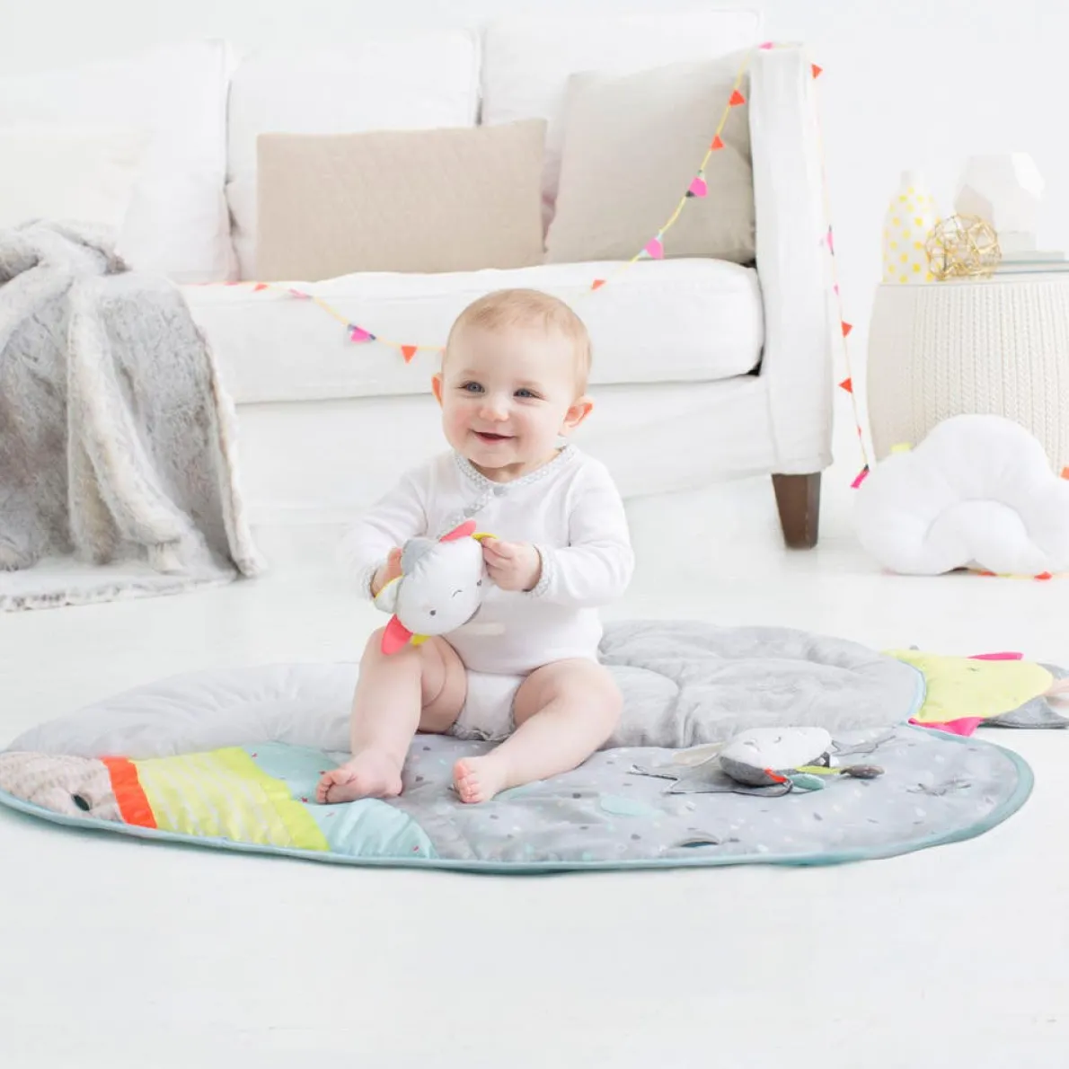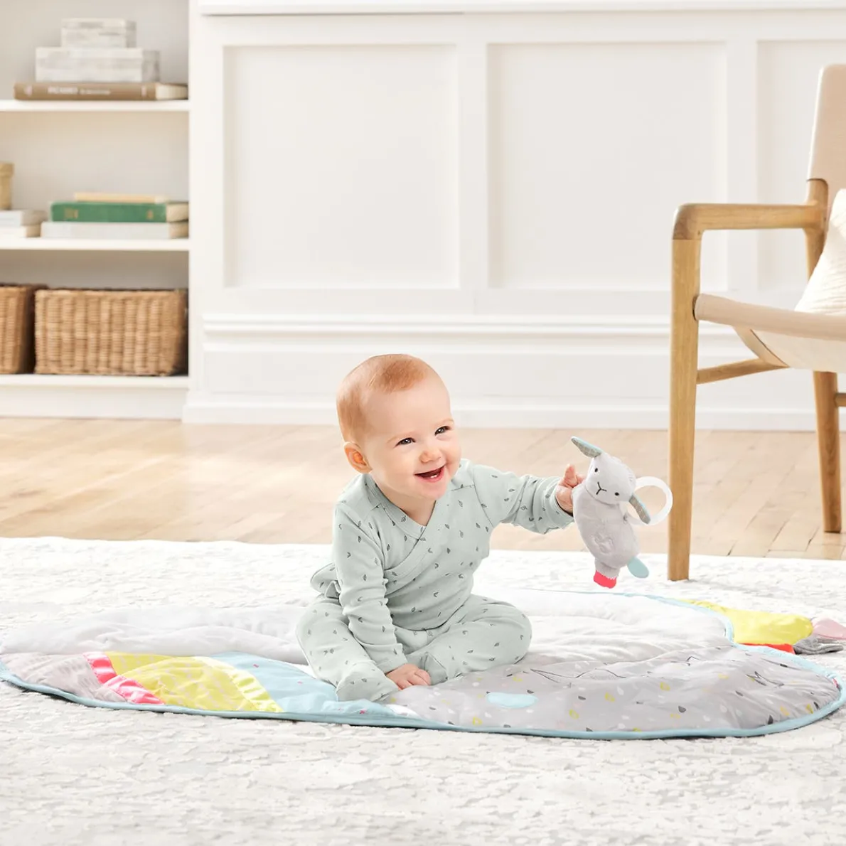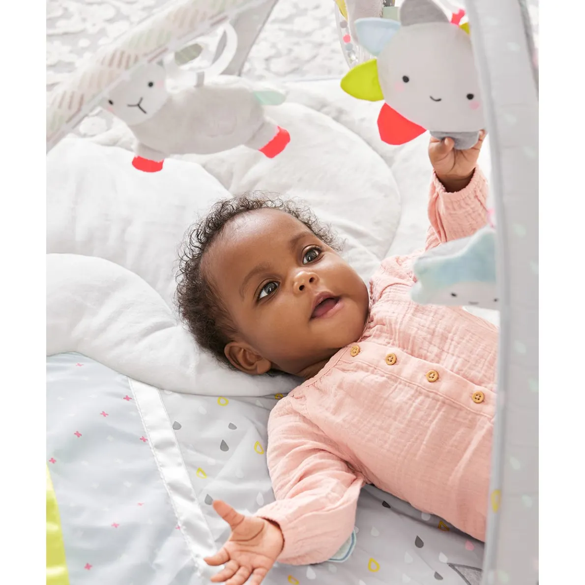 Every cloud has a silver lining—and this dreamy baby activity gym is no exception! Offering hours of plush playtime, it features a soft color palette to complement modern décor along with pops of bright colors to stimulate baby’s sight. Five celestial-themed hanging toys will engage baby with lights, music and other stimuli while the cushy mat offers ultimate, cloud-like comfort. When it comes to baby’s enjoyment, the sky’s the limit!