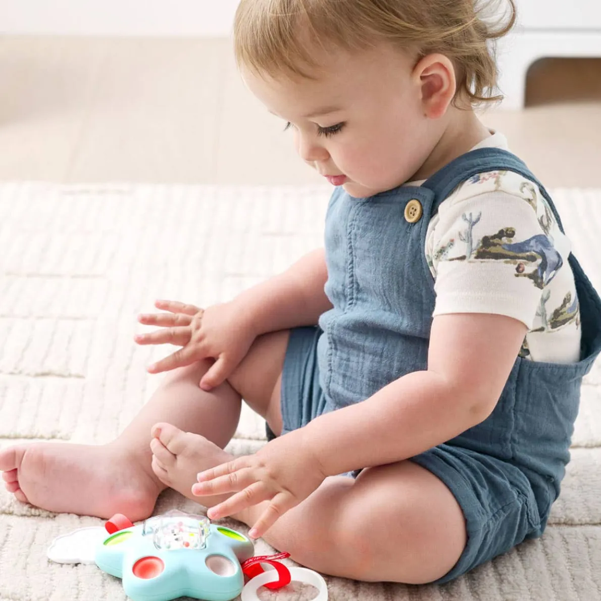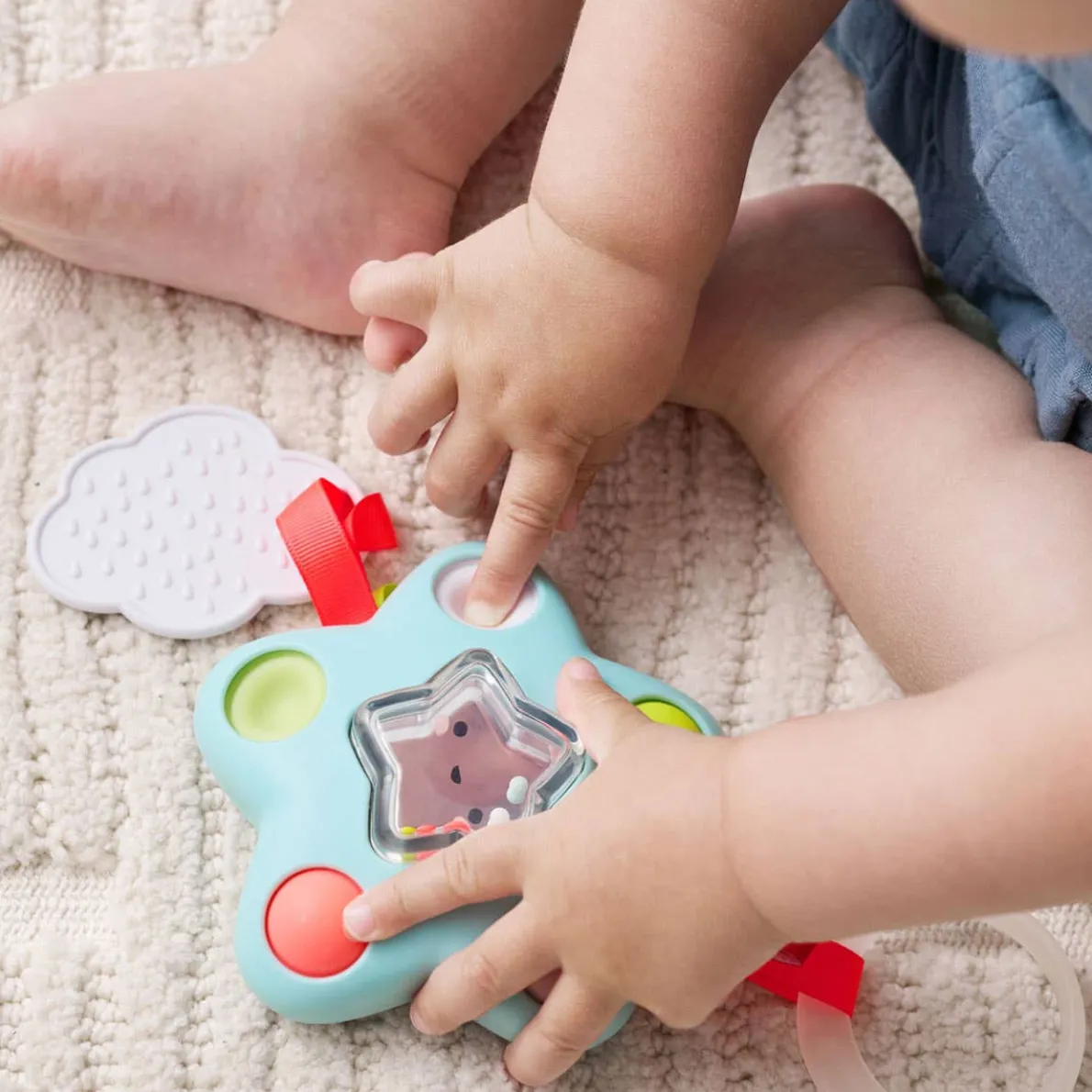 This star-shaped sensory toy keeps little hands busy at home and on the go. Designed for sensory play and exploration, it features five soft silicone poppers that are fun to press while helping build fine motor skills. It also included rattle beads, a textured cloud teether and colorful ribbons.