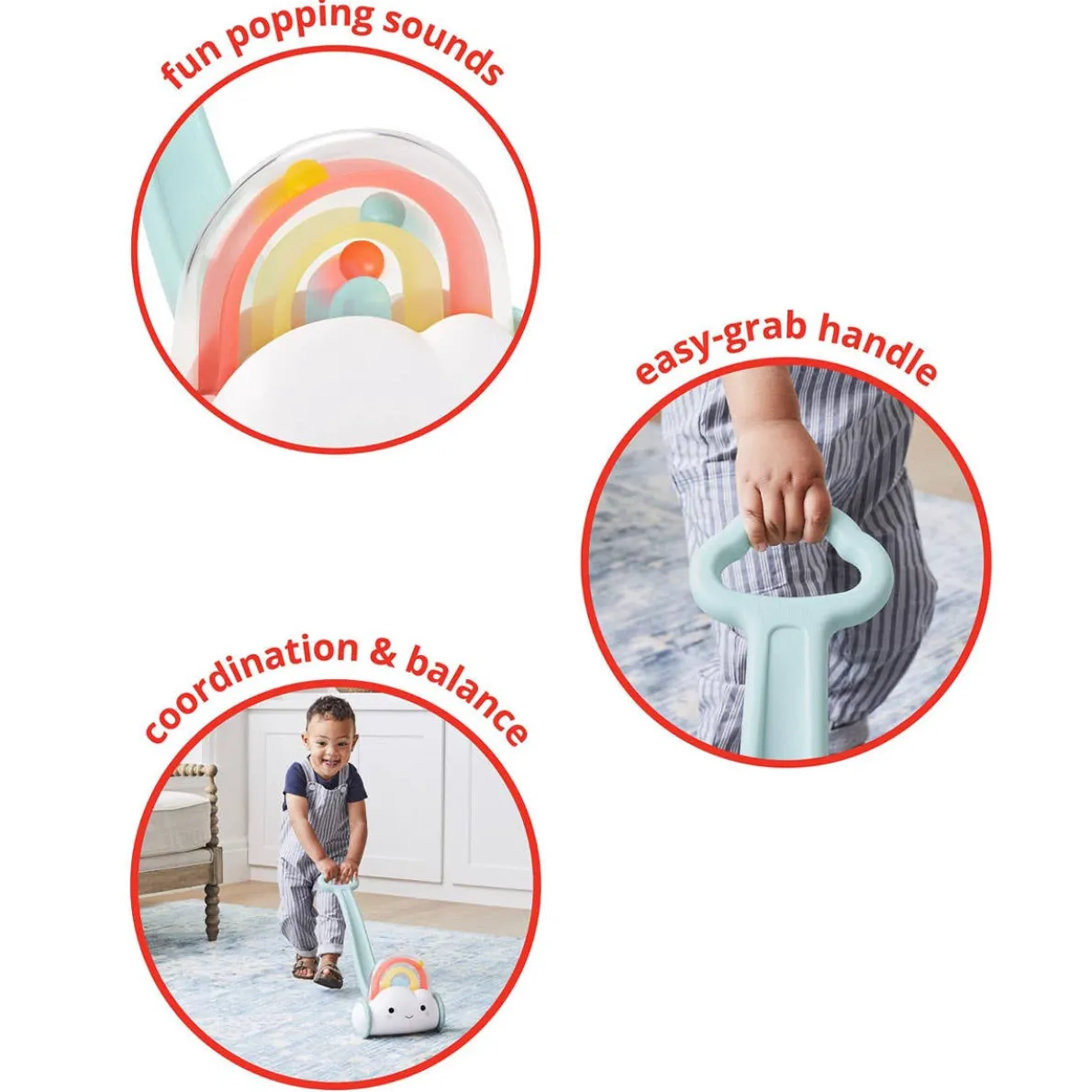 A classic push toy with a rainbow-bright twist, our cute and colorful design encourages baby’s first walking adventures. With every step baby takes, a rainbow with colorful balls rewards baby with fun popping sounds. A great way to build walking confidence, gross motor skills, balance and more at playtime.