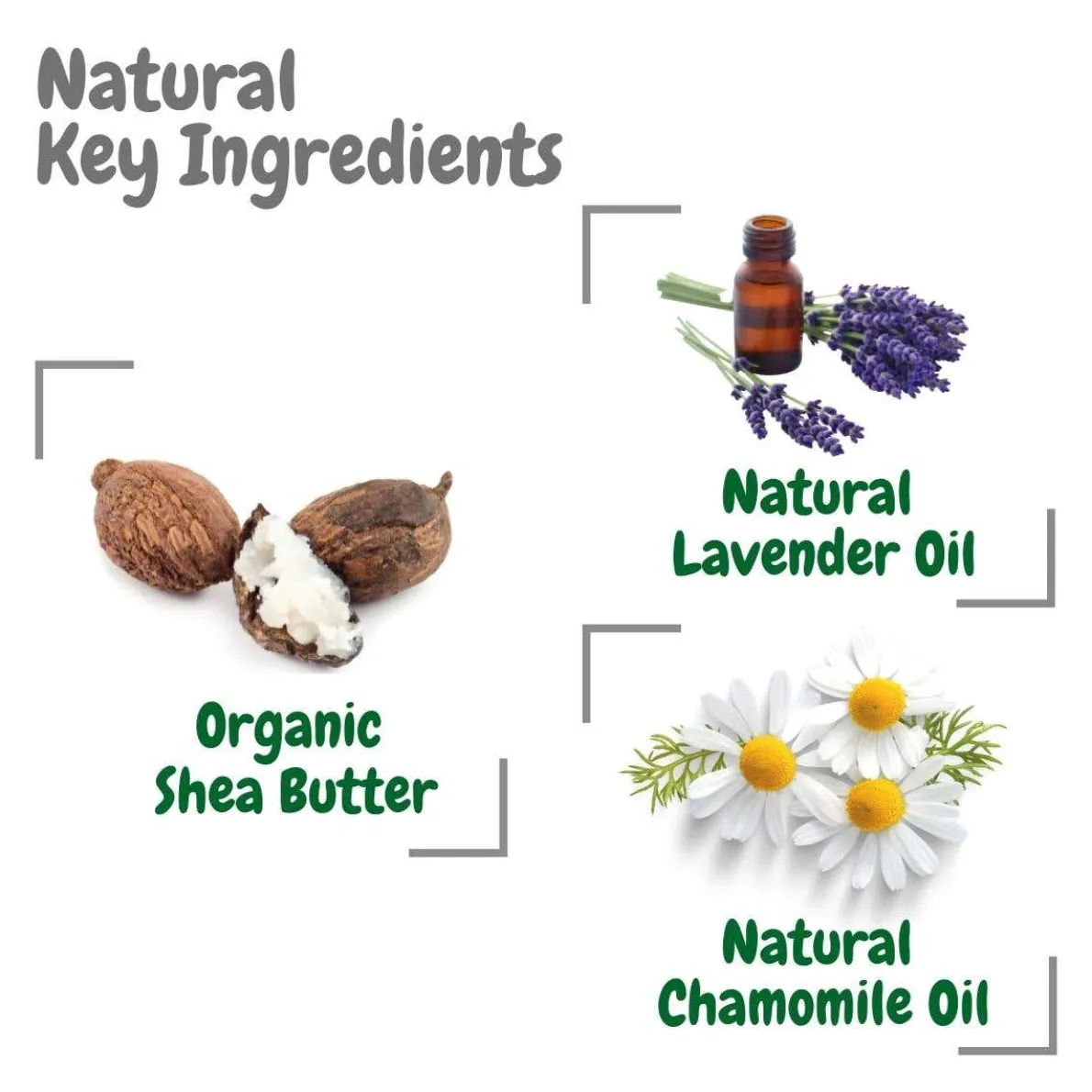- Organic Shea Butter, Lavender and Chamomile moisturizes you baby’s skin, leaving it feeling soft, supple and silky smooth.