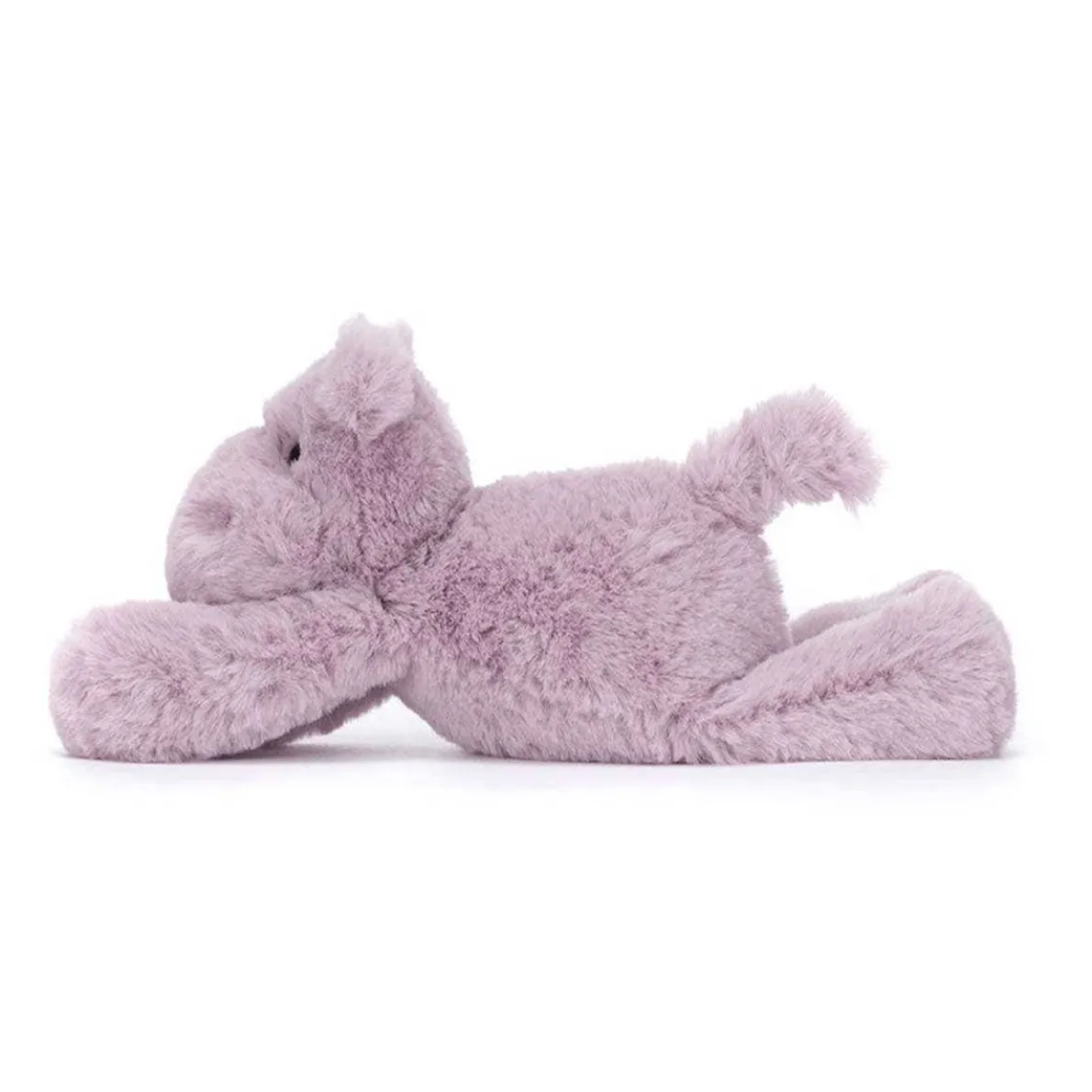 Smudge Hippo is a smiling sweetie in super soft lilac fur. With dainty ears, stitched nostrils and a curved tail, this lilac lovely has long legs and a squishy tummy. A loving companion, Smudge Hippo is a great gift for any bouncing baby.