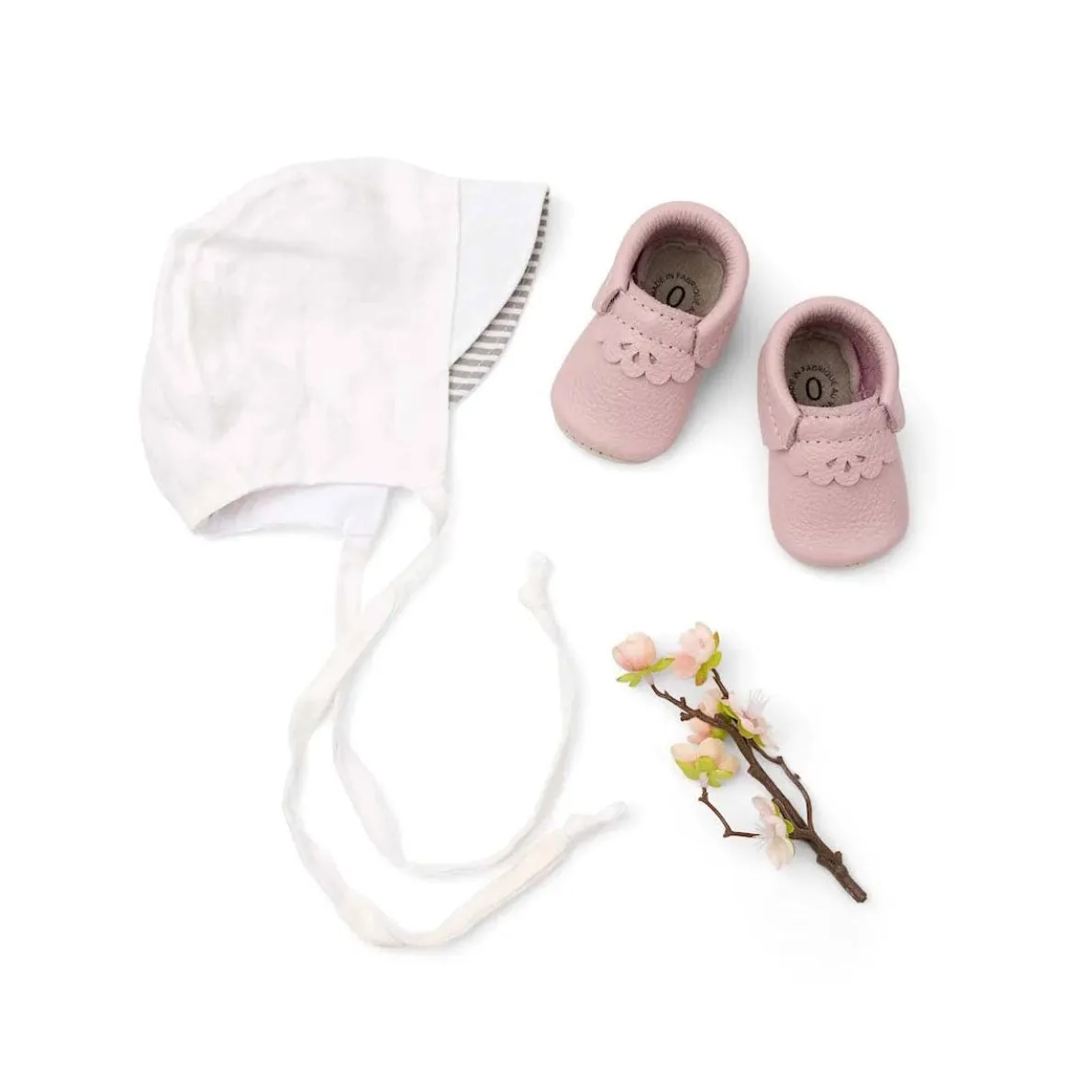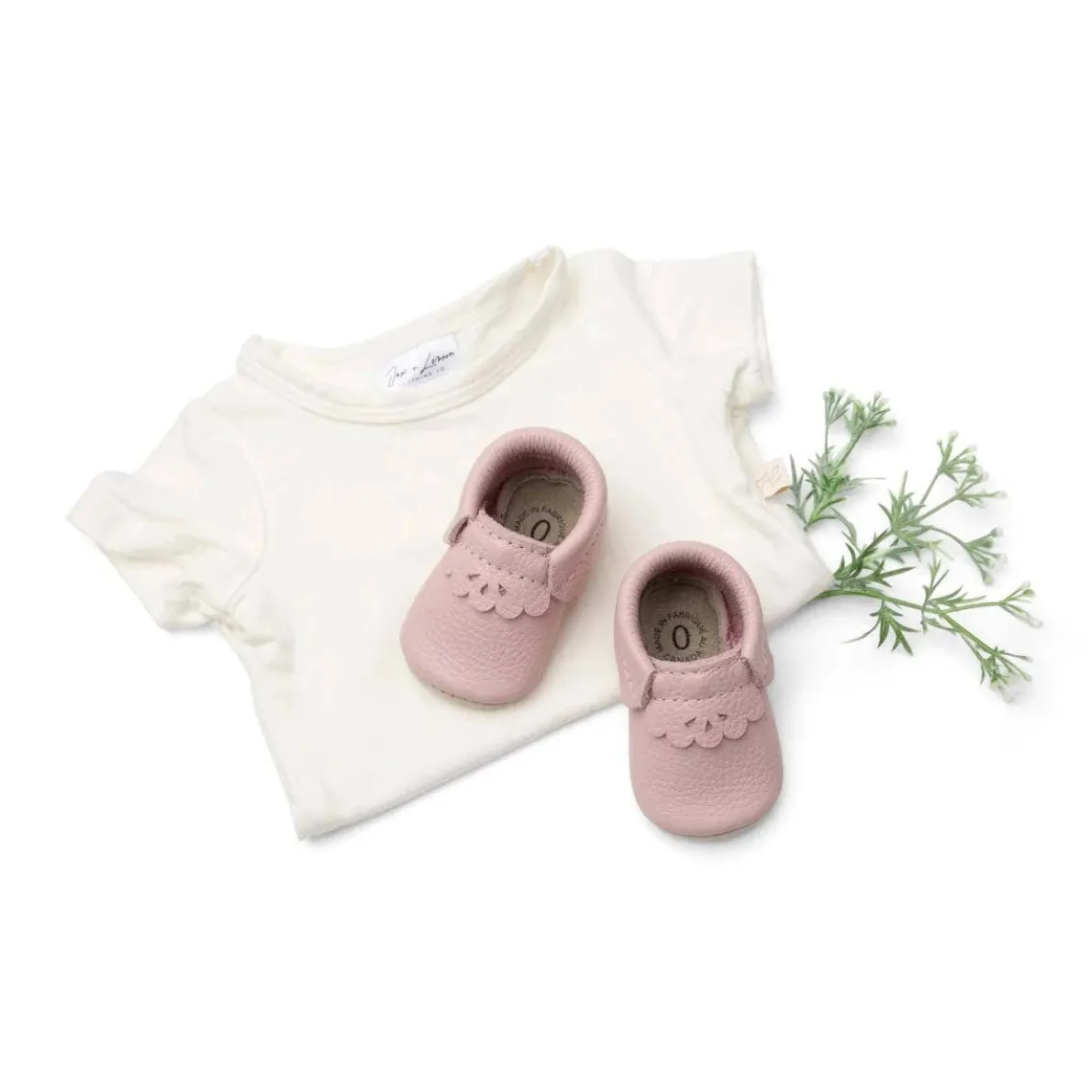 The Soft Soles are made from 100% genuine leather at the factory, in Abbotsford BC. They feature an elastic at the opening, making it easy to slide them on and off and keeping them from falling off even the wiggliest of feet! Babies benefit from wearing soft soles, especially as they learn to walk, as they create a ‘barefoot’ feel while also offering protection against the elements.