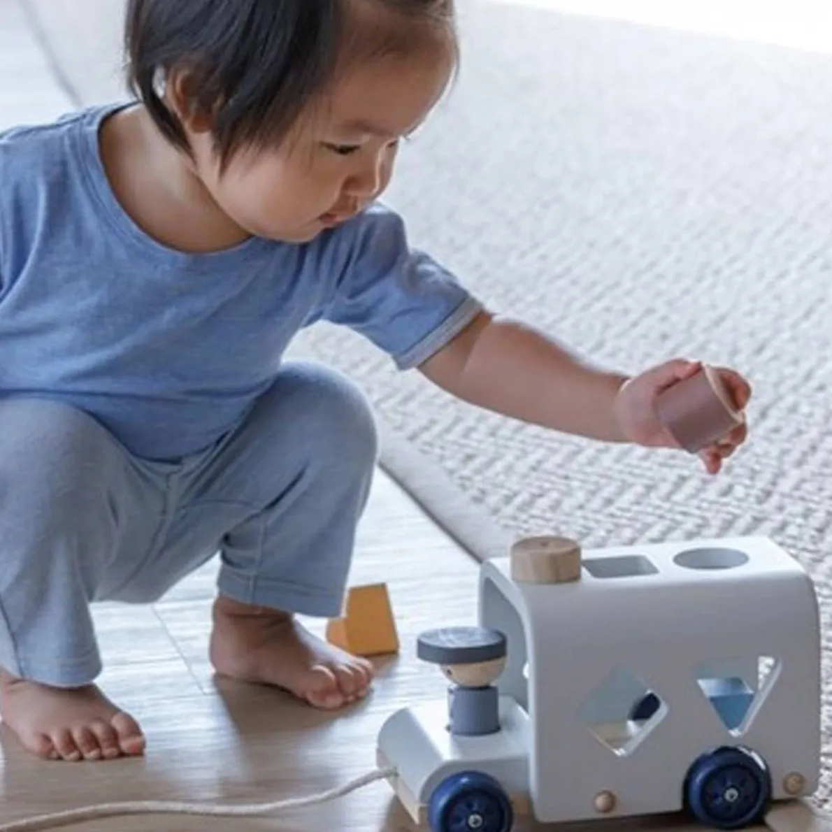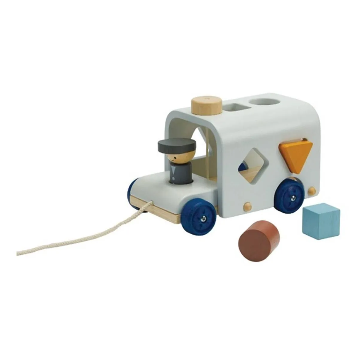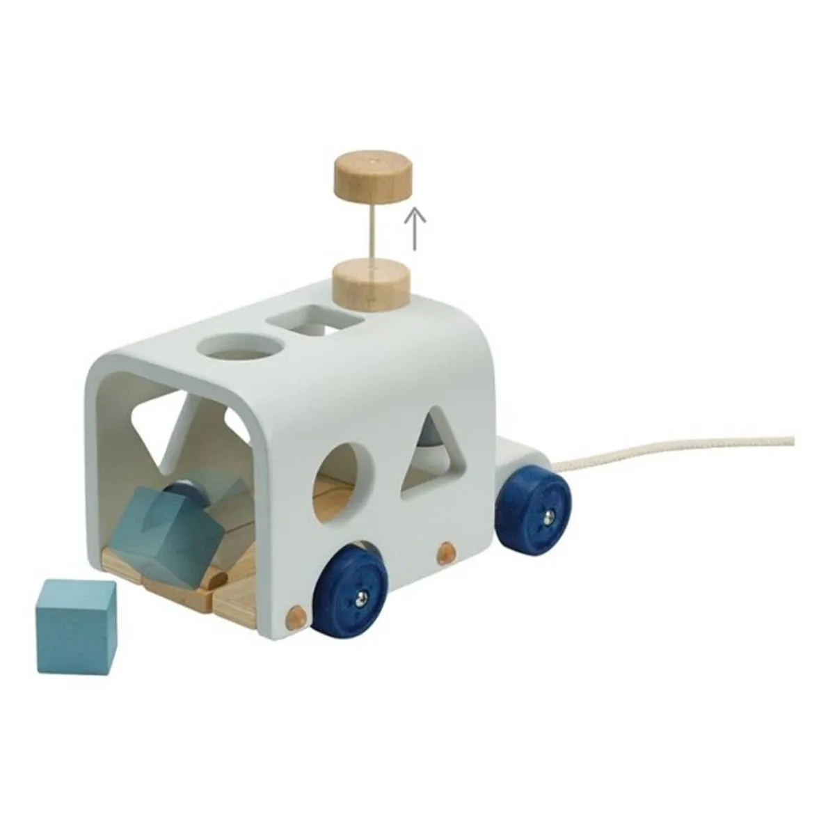 This Sorting Bus contains 3 colorful shapes. Pull the tab on top of the bus and all the pieces will slide out.