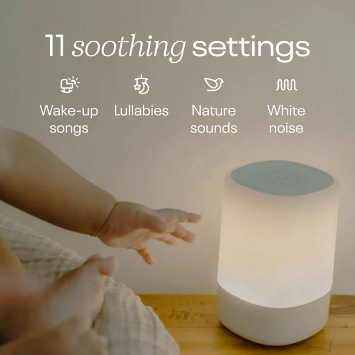- Sound machine has 11 soothing settings, including white noise and nature sounds, lullabies, and wake-up songs