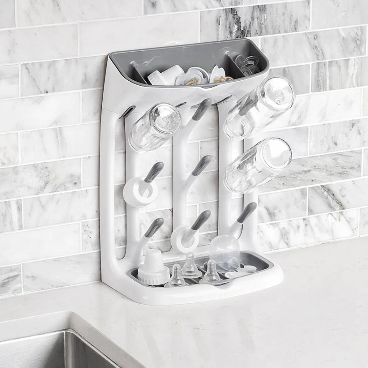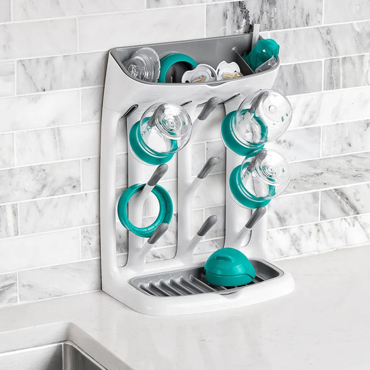 With a compact design that makes a big impact, the Space Saving Drying Rack will hold cups, bottles, and all their parts without cluttering the countertop. The angled pegs hold cups and bottles at just the right angle for thorough drying, while the top and base are perfect for drying small parts like valves, or even pacifiers. The Drying Rack fits neatly under cabinets, so it can be tucked out of the way against the wall. The base tray features ridges to keep lids and more elevated for quick drying, and both the base and top trays are removable for thorough cleaning.