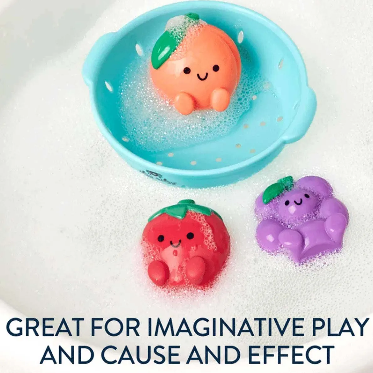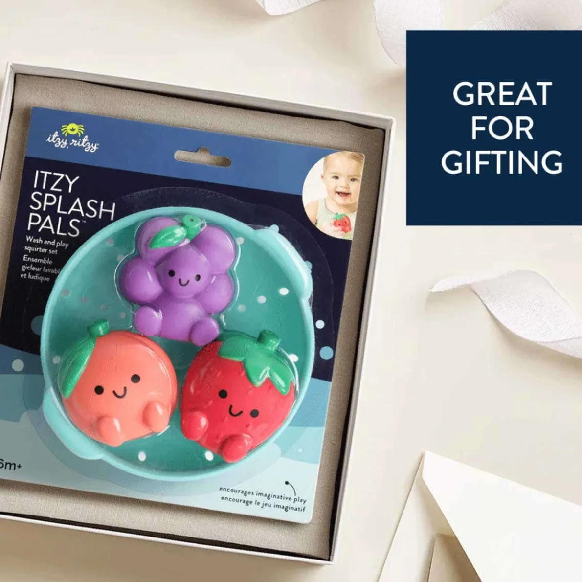 Squeeze in some fun! With Itzy Splash Pals™ bathtime play is overflowing with possibilities! These squeezable fruit-shaped squirties and sprinkle strainer encourage motor skill development and are great for creating endless bath time adventures!