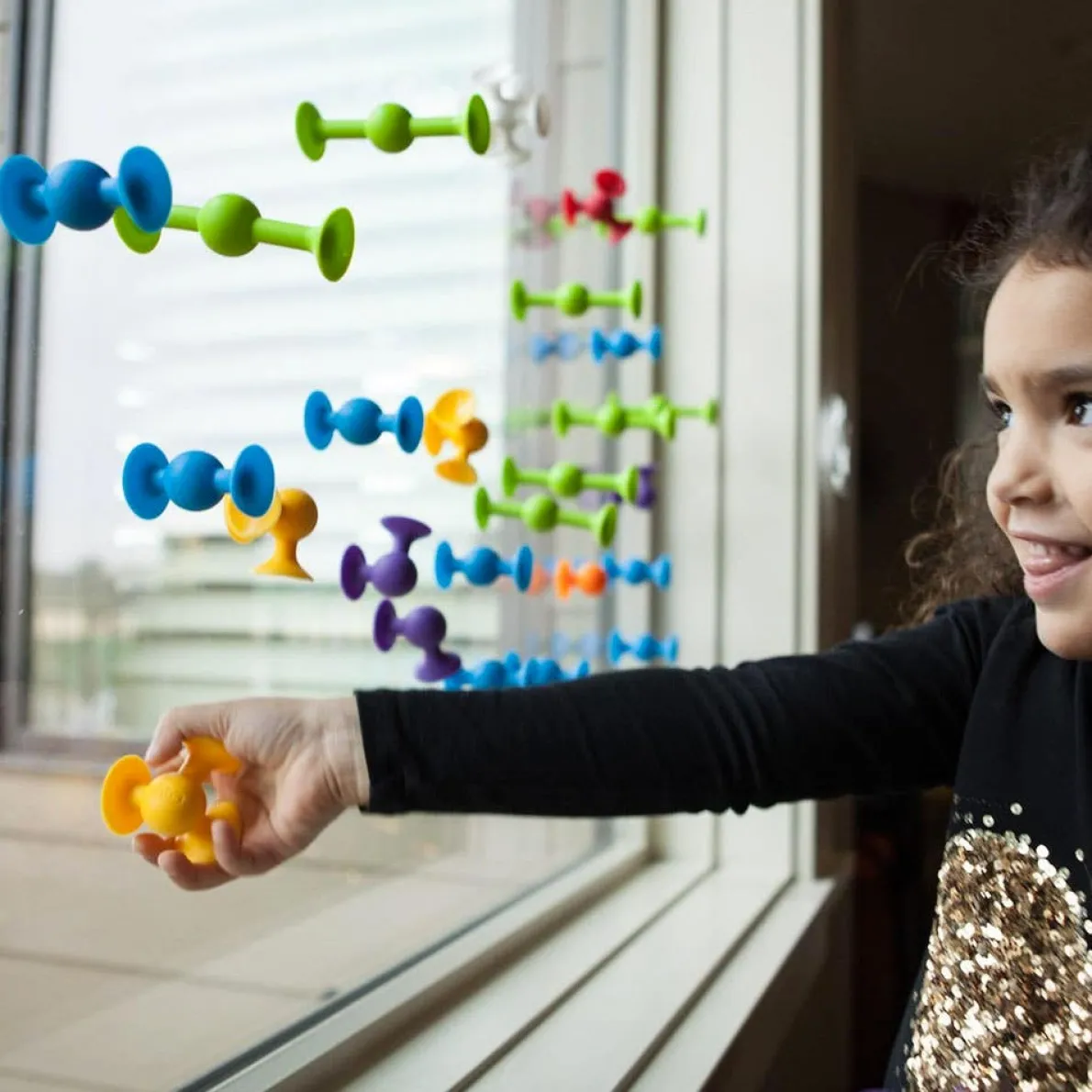 Squigz are scientific sorts – always up for playful experimentation and defying gravity – sticking to bathtubs, windows, school lockers, tabletops, and office desktops. (And they are mannerly guests too – never leaving a trace of their presence.)