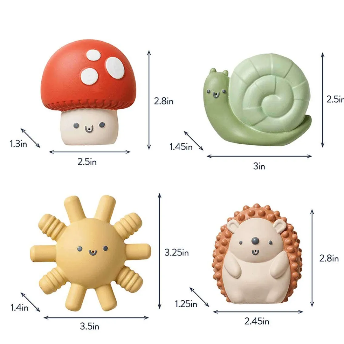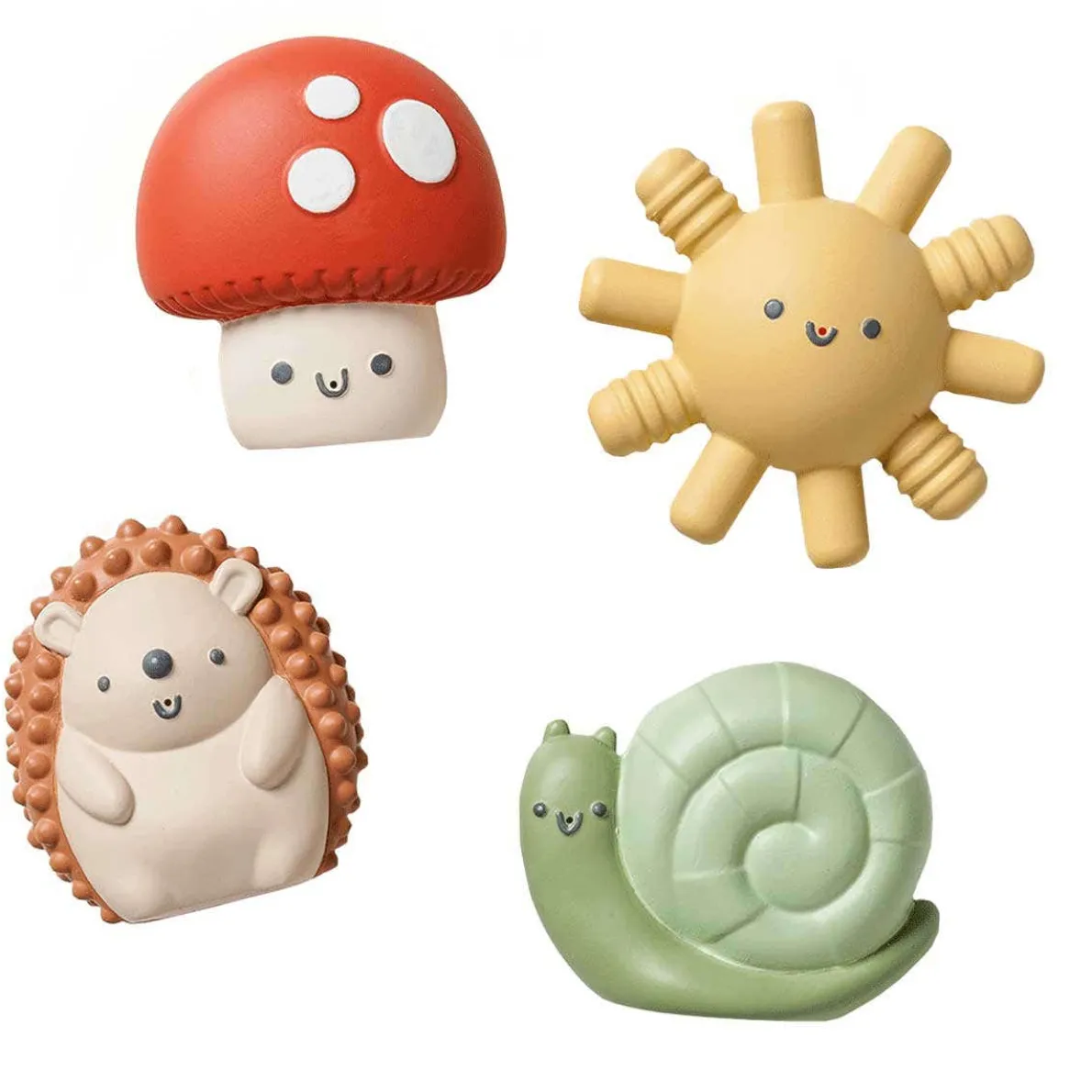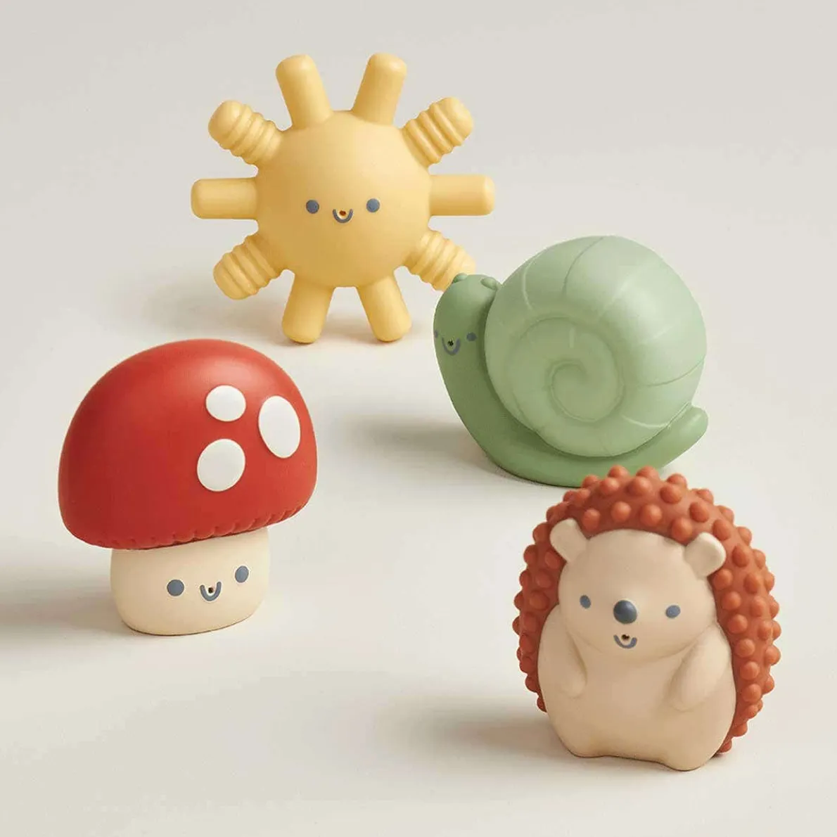 4 soft, colorful characters with a wide range of textures and shapes to stimulate the senses. Perfect for Bath play squirters.