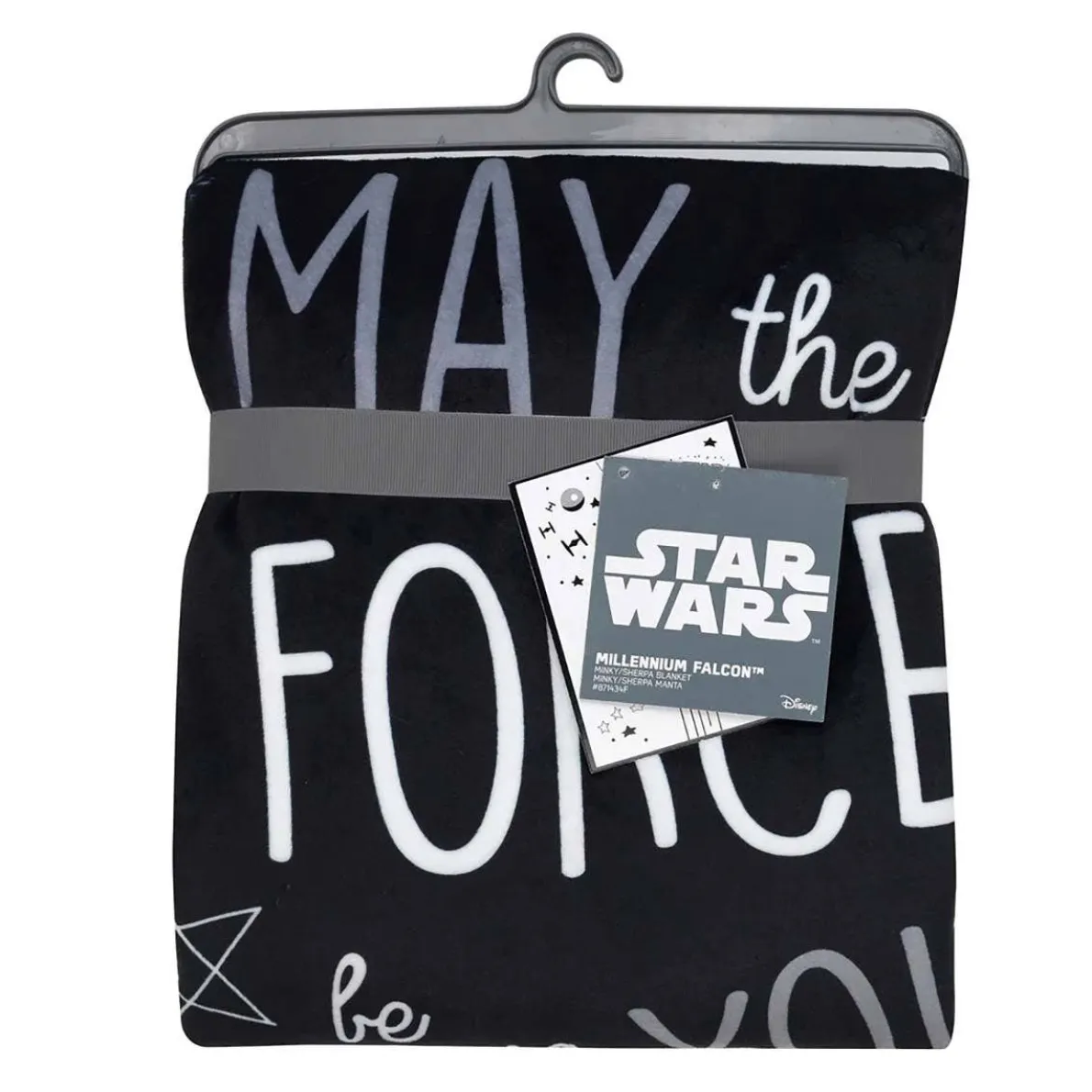 Your little padawan (Jedi in training) will love this officially licensed Millennium Falcon baby blanket. The large black Falcon is 23” in length and is featured in the center of this soft minky blanket. MAY THE FORCE BE WITH YOU is printed in gray and white along with Tie Fighters, the Death Star, stars, and the words Star Wars. The back of the blanket is a cozy white Sherpa. This makes the perfect stroller blanket sized at 30” X 40”. A top baby registry pick and favorite baby shower or welcome home baby gift.