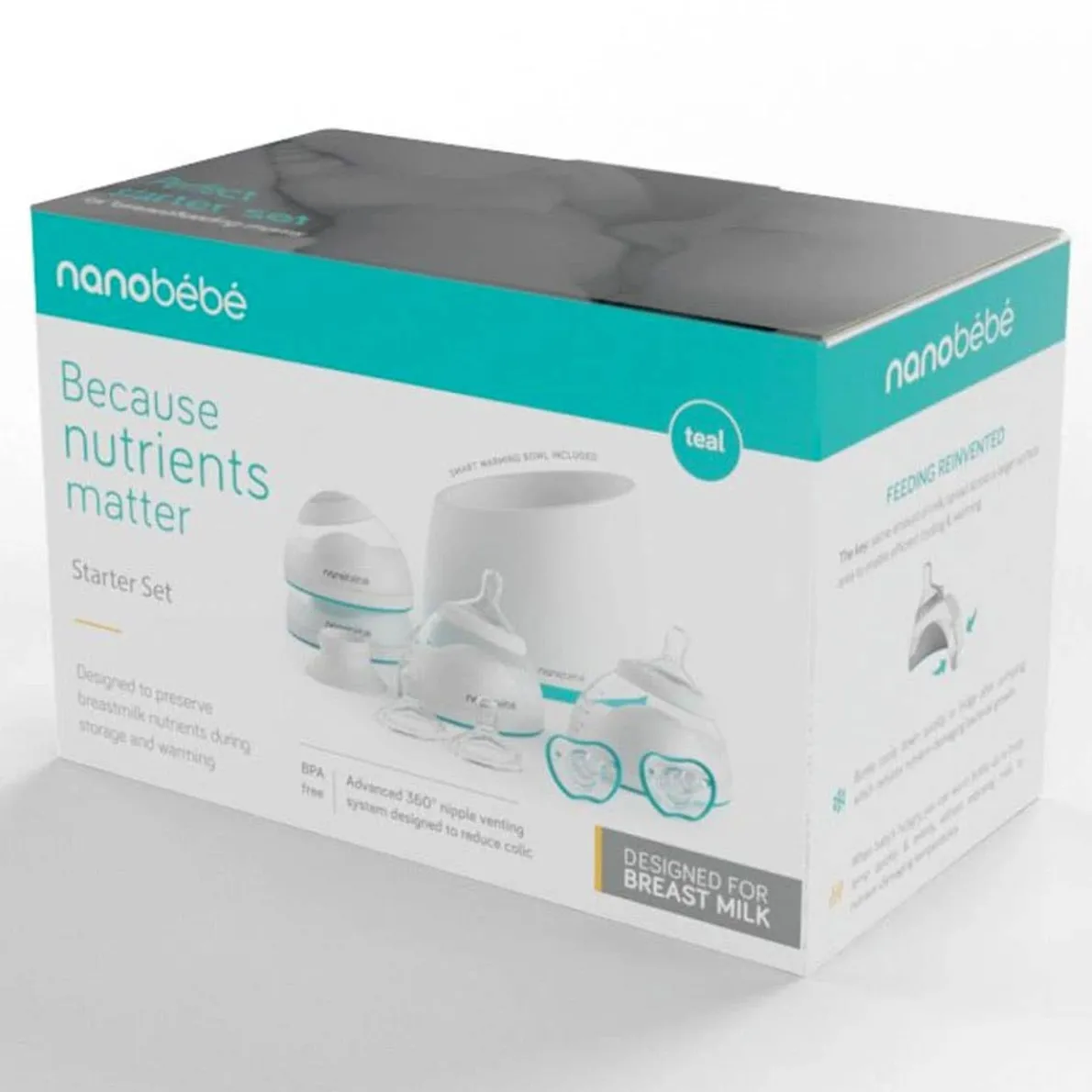The Nanobébé starter set includes some of the most innovative essentials: Breastmilk Bottles to help preserve breastmilk nutrients during storage and warming, the nanobébé nonelectrical Smart Warming Bowl for quick and even warming of breastmilk, as well as nanobébé’s Flexy pacifiers.