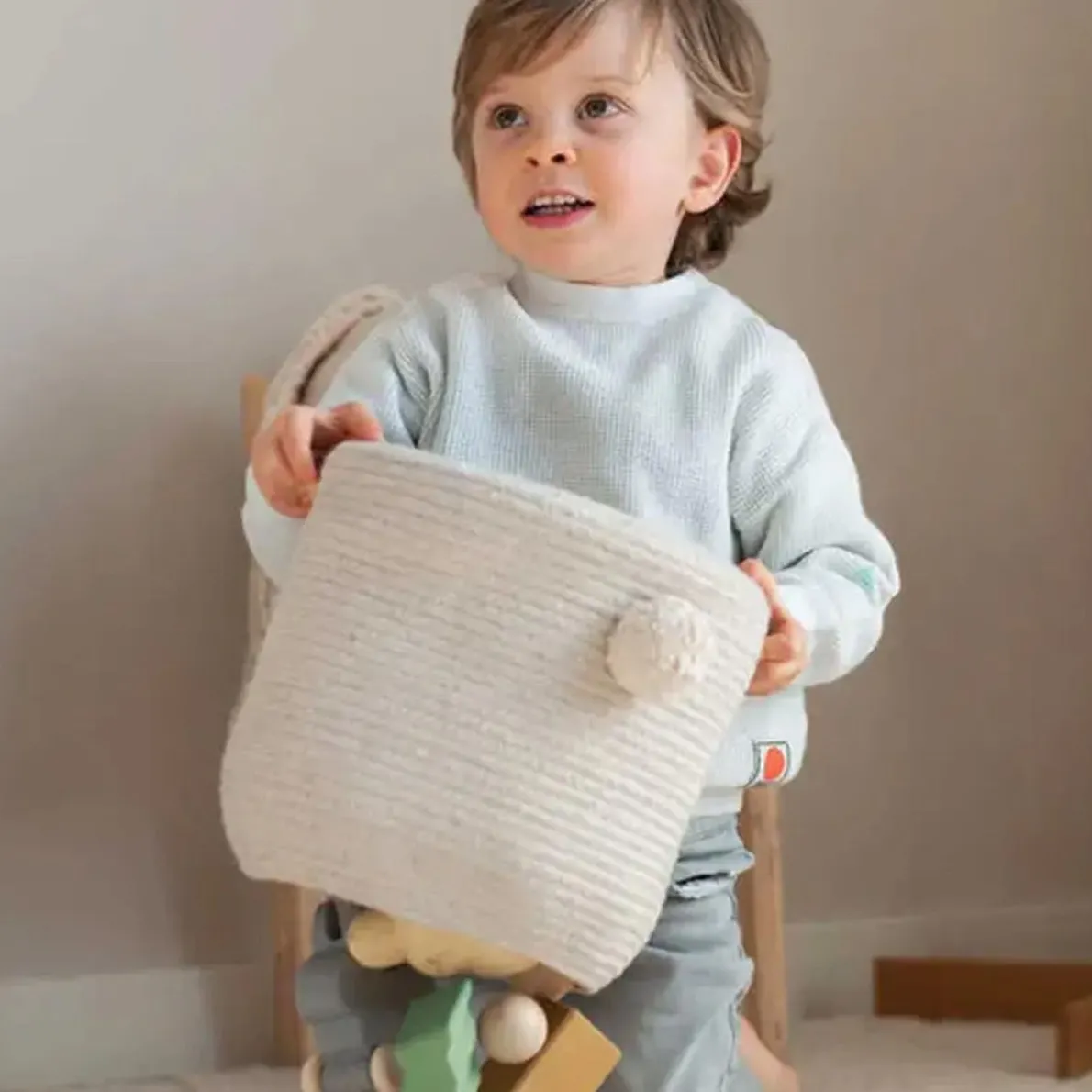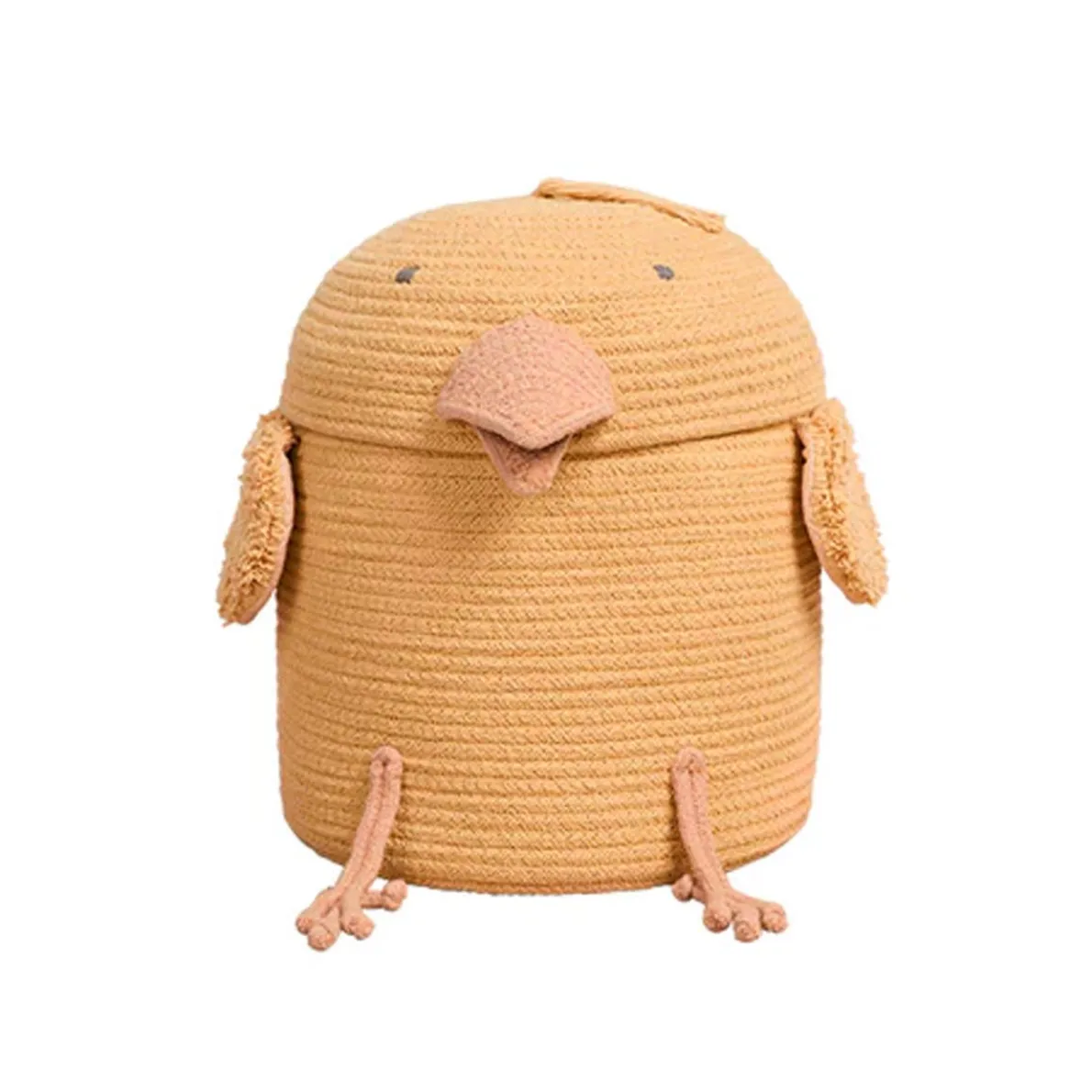 The cutest little chicken made of braided cords! Handcrafted using a braided cord made of fibers from recycled PET bottles mixed with cotton yarns in soft Golden color, the Charlie the Chicken basket has a beak and braided legs in Rose, and tufted yellow wings.