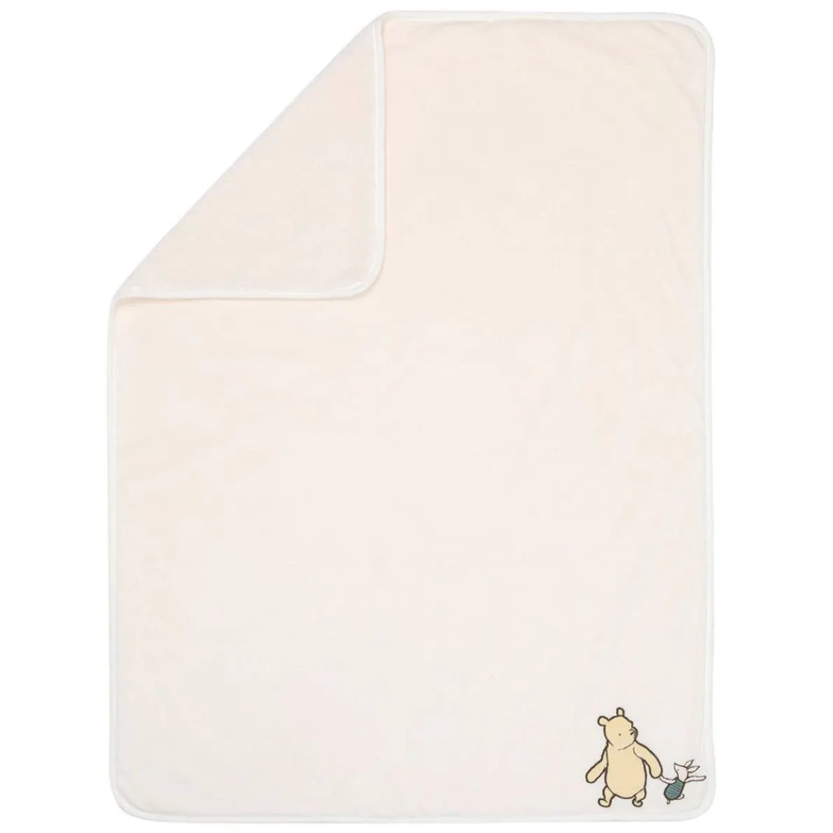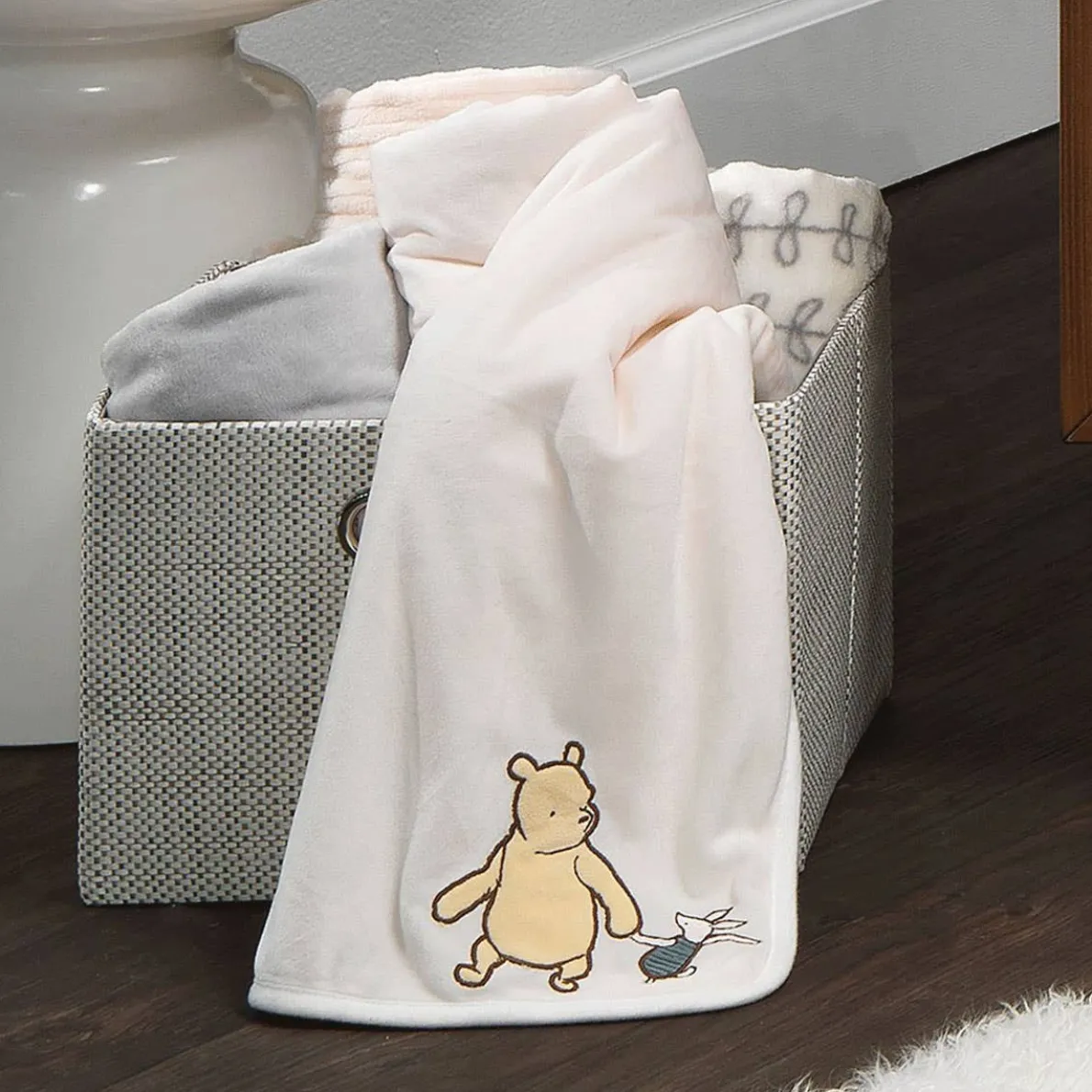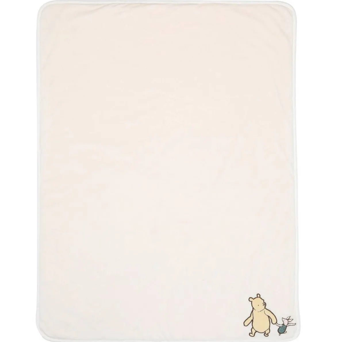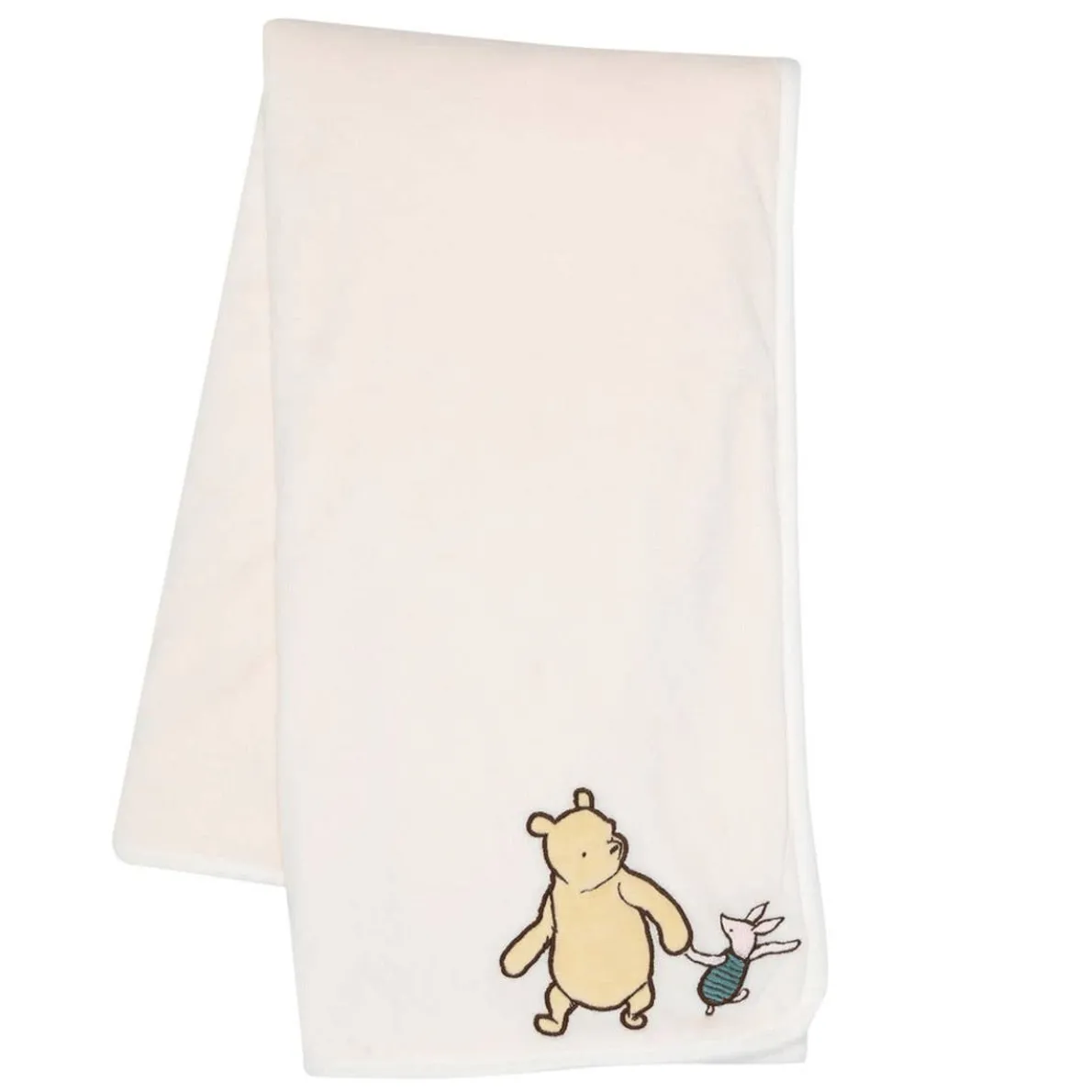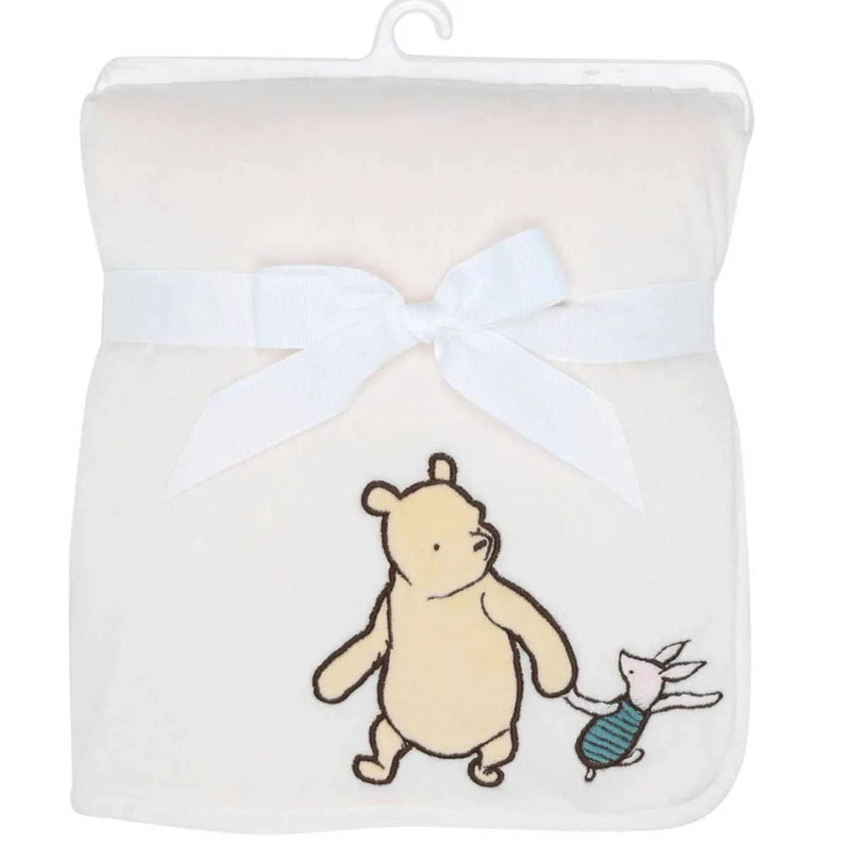 Cuddle your little one in this soft creamy white minky blanket. Disney’s lovable Classic Pooh is appliqued with his forever friend Piglet. The back of this Winnie the Pooh blanket is a luxurious white Sherpa. Sized at 30” X 40” this stroller blanket makes a great baby shower gift and is a favorite baby registry item.