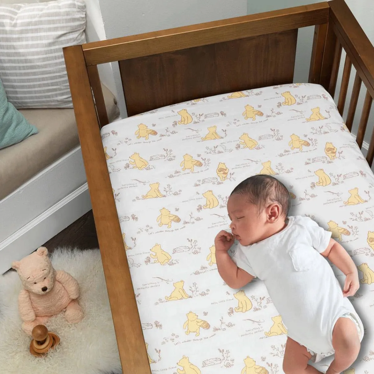 This breathable 100% cotton fitted crib sheet features Classic Pooh in a variety of poses. Winnie the Pooh is holding his favorite honey pot, interacting with a squirrel and a dragonfly, and wandering through the woods. The crib sheet has elastic all the way around ensuring a safe and secure fit on a standard-sized crib mattress measuring 28” X 52”.