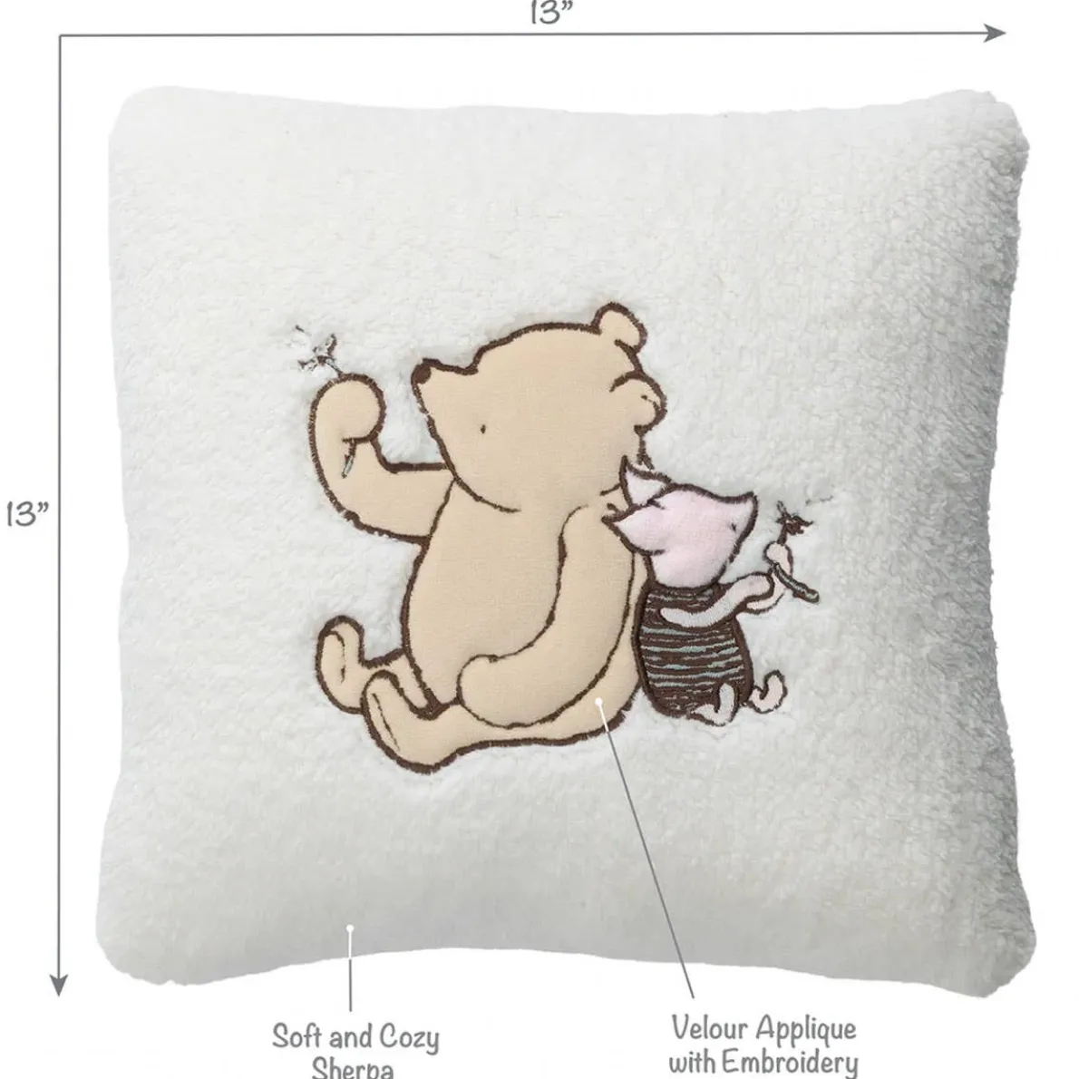 This charming soft and cozy keepsake nursery throw pillow features Classic Pooh back-to-back with his sidekick Piglet. The pillow is made of an ultra-soft creamy white sherpa. It is 13” X 13” and the center embroidery is 7” X 6”. Winnie the Pooh is a creamy yellow velour with embroidered outlines and Piglet’s body is teal velour with brown embroidered stripes. Both Pooh and Piglet have a dandelion stem in hand. This pillow is machine washable for easy care.