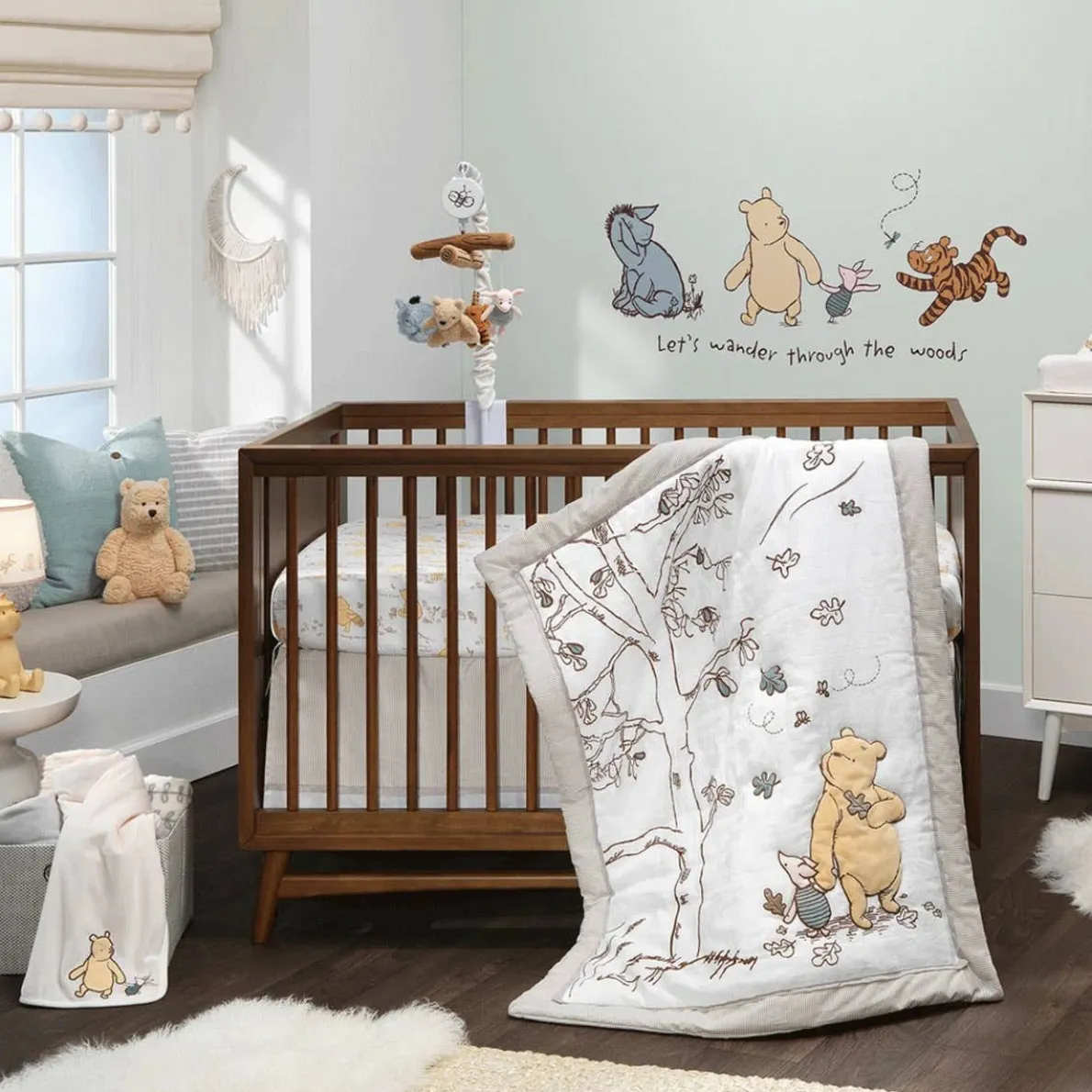 Add a designer touch to a feature wall in the nursery with these custom Storytime Pooh wall decals. Included is Pooh, Piglet, Eeyore, and Tigger, who loves chasing the dragonfly, along with the message “Let’s wander through the Woods.” These are easy to apply and will not harm your walls.