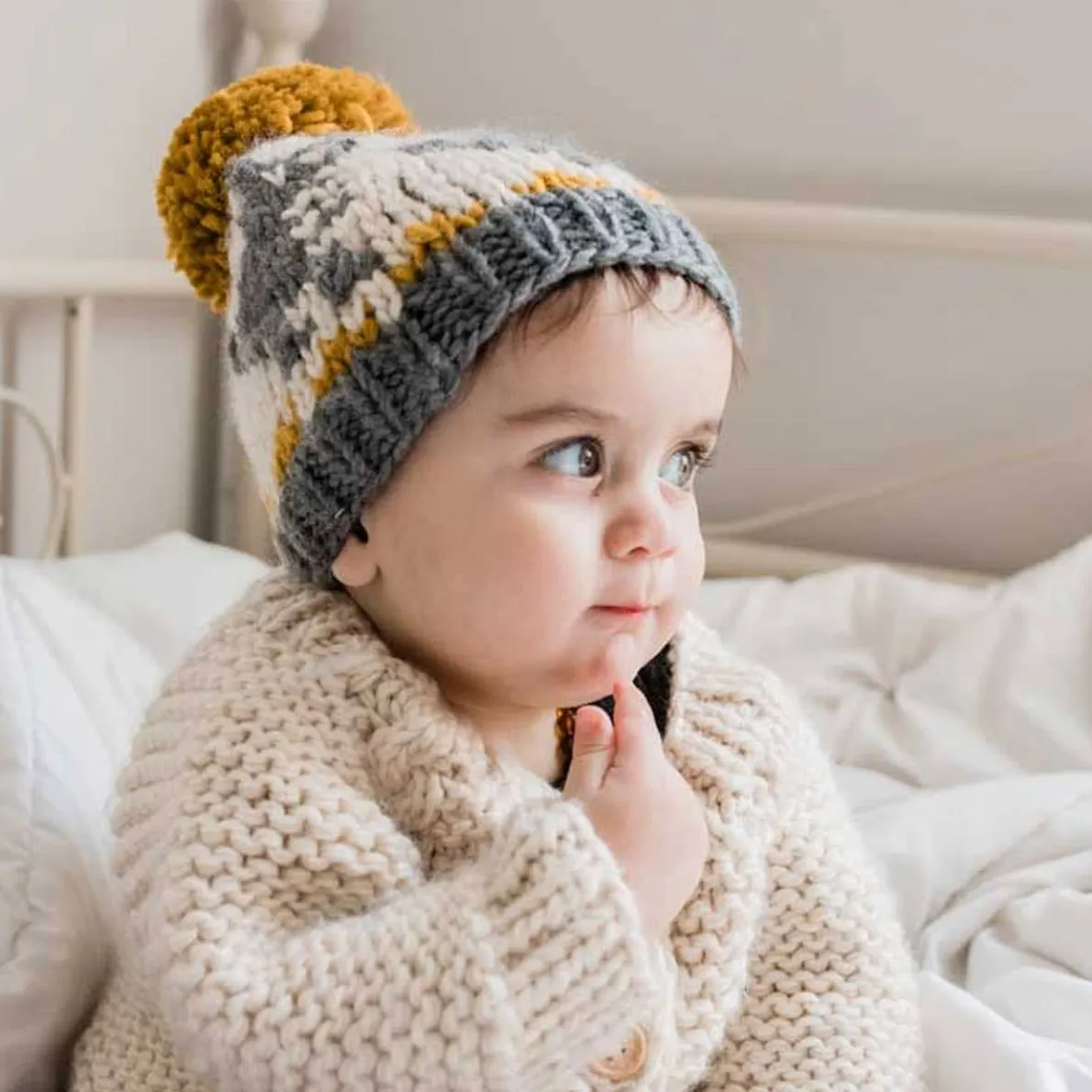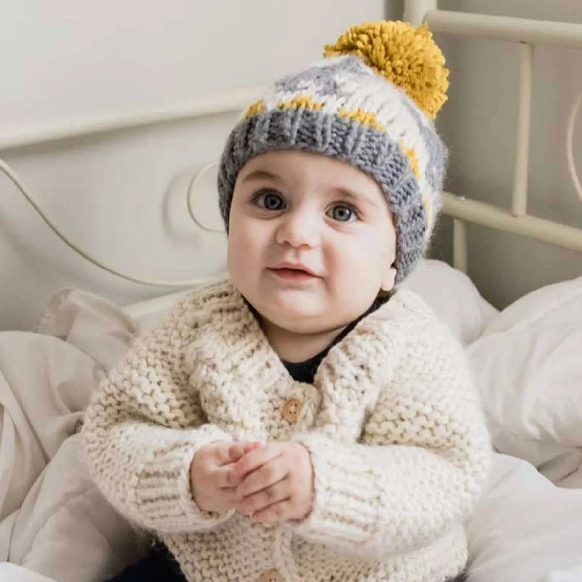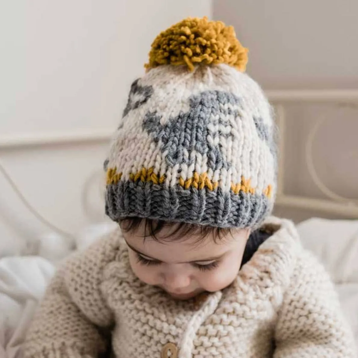 Roar like a dinosaur in this cozy hat, hand knit in soft Icelandic acrylic yarn in natural, gold and grey hues. It’s great for everyday wear makes a great gift!