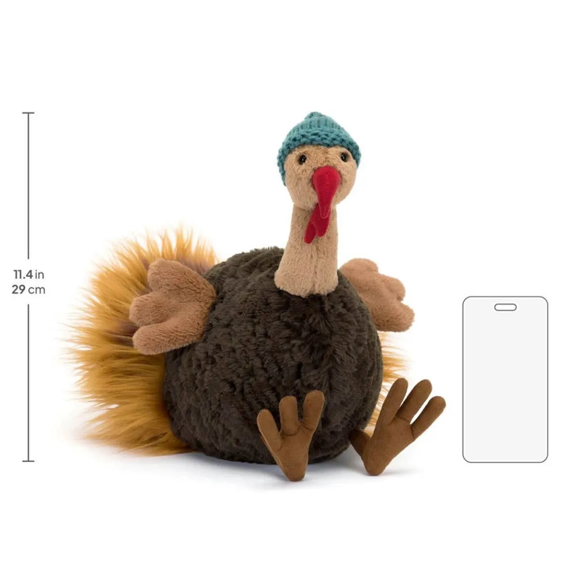 Theo Turkey may have plumage, but this turkey’s taking no chances. He’s knitted himself a bold teal hat, ready for the winter! Theo has over-sized honey feet, a round cocoa tummy and a silky ginger tail. Most impressive of all, this proud turkey has a beautiful suedette caruncle (that’s the wobbly bit under his beak). A dazzling gift for happy holidays.