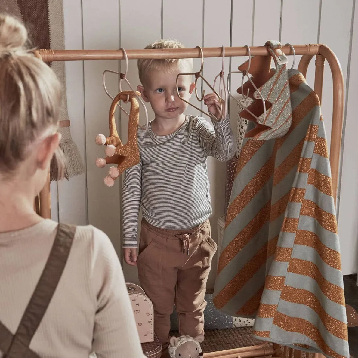The Fuku hanger has a perfect size for the children’s outerwear in the wardrobe or clothes in the children’s room. Use the Tiny Fuku hangers in the wardrobe with the Fuku hangers and make room for the whole family’s outerwear. The Fuku hangers are a simple and elegant hoop that serves a practical purpose.