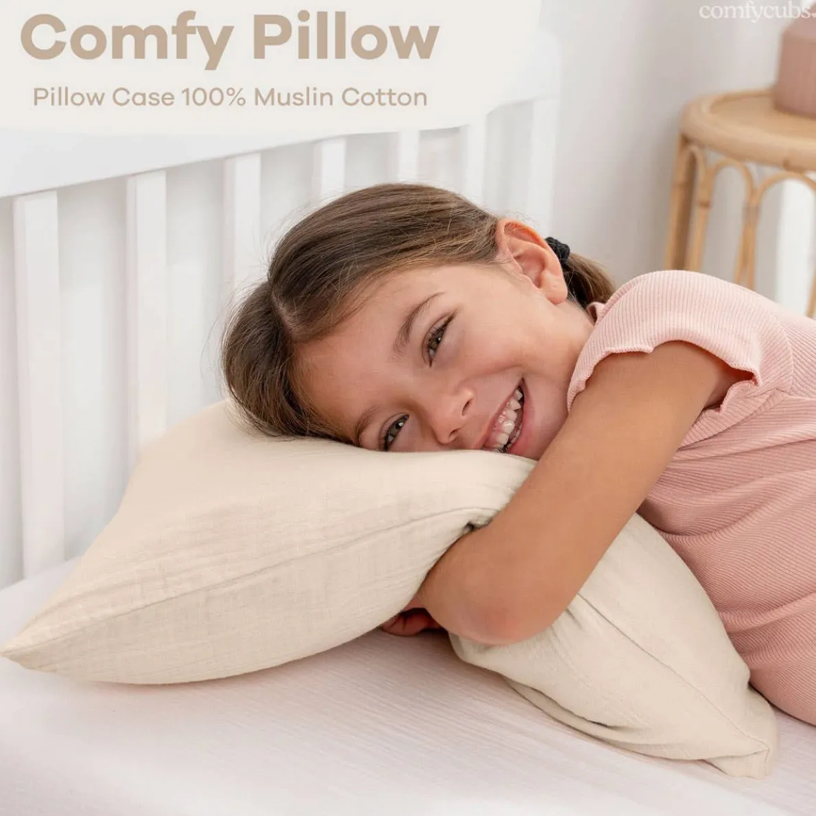 The Comfy Cubs toddler pillow with muslin pillowcase offers soft, breathable comfort and ergonomic support for your toddler’s neck and spine, with durable, machine-washable muslin that stays soft wash after wash.