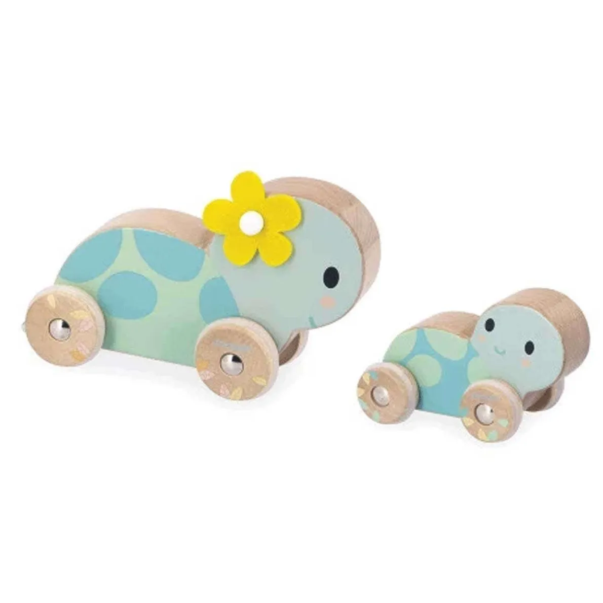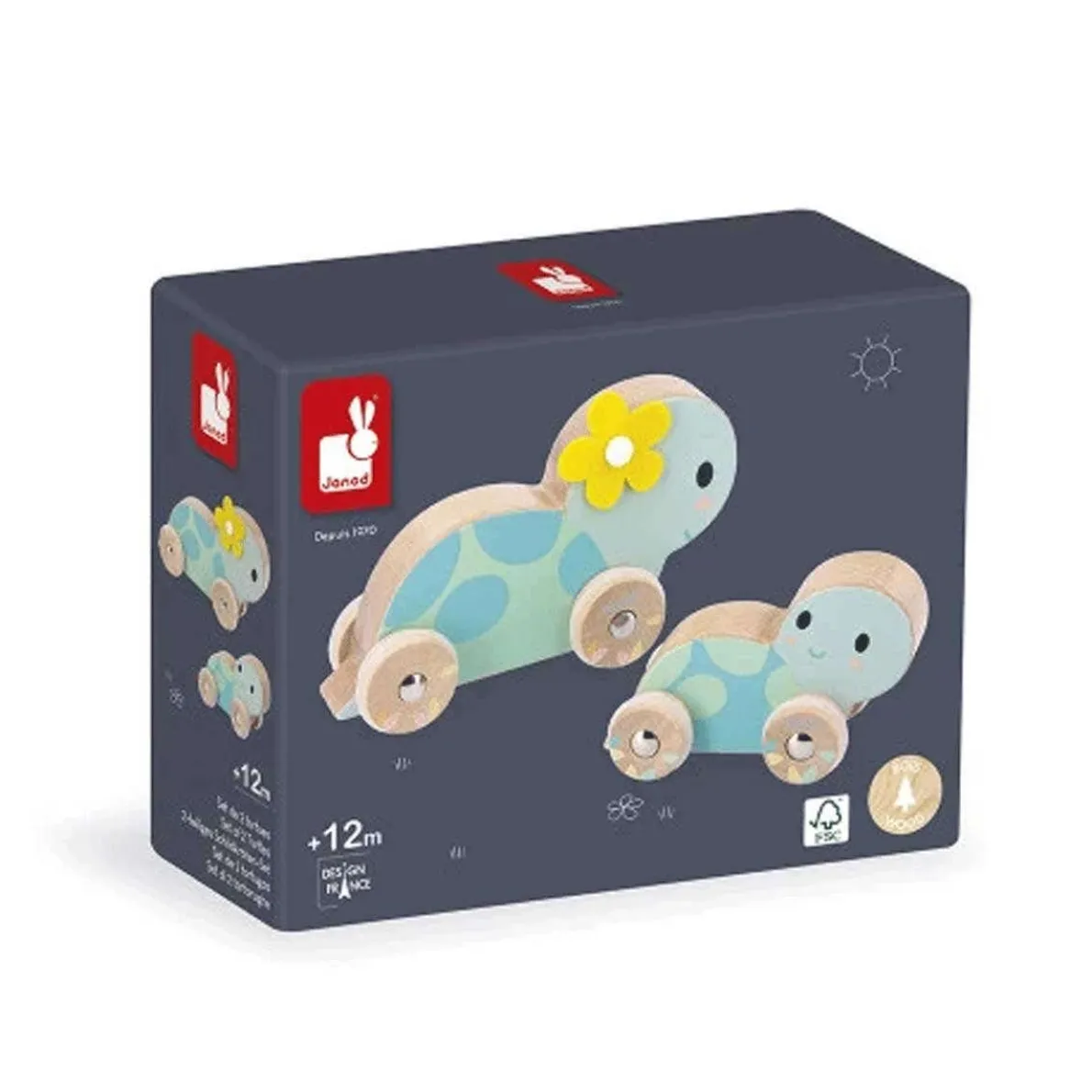 Big turtle and little turtle are out! Ideal for little toddlers from 12 months, this walking toy features an adorable duo of wooden turtles. Their rounded shape and 5 cm width make them easy for little ones to hold for long walks! Baby will love rolling these two new friends side by side. It’s also a great early-learning toy for entertaining two children at the same time: each to his own turtle! The large turtle features a pretty felt flower on its head, for an interesting tactile touch to browse. Another plus: the silicone coating on the wheels keeps them quiet! With these wooden walking toys, babies can develop their motor skills and imagination: what adventures will our two turtles embark little ones on today? From Pure collection of wooden early-learning toys, this set of 2 rolling turtles is made from FSC™-certified wood