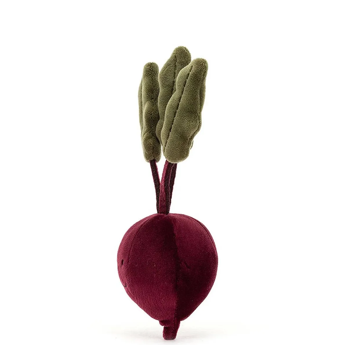 More stretchy than crunchy, Vivacious Radish is a most refreshing friend! Perky in pink-white ombre fur, with a plume of stitchy green velour leaves, this affable vegetable pops up to say hello! A kitchen mascot or goofy gift with the happiest smile in the salad drawer!