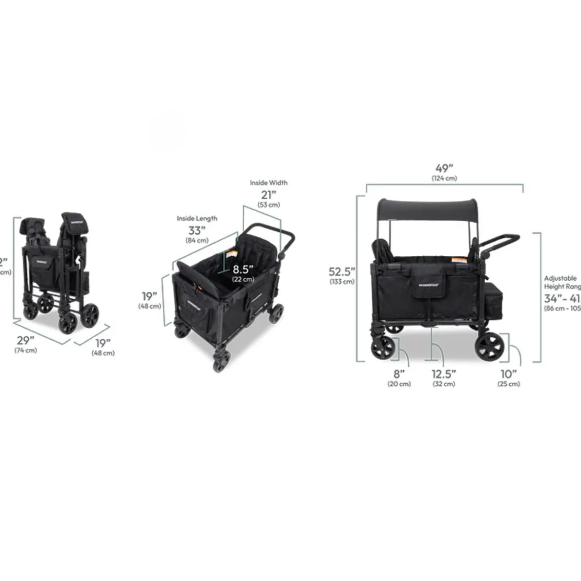 Venture out effortlessly with the W4 Elite Pro Stroller Wagon. It features elevated, reclining seats for a better view, spacious seating for up to four, a lightweight aluminum frame, safety features, and sun protection. Versatile seating can face forward or backward, with removable frames and front-zippered entrances for easy access. With WonderFold, focus on creating lasting memories, not just managing logistics.